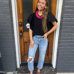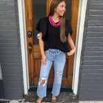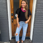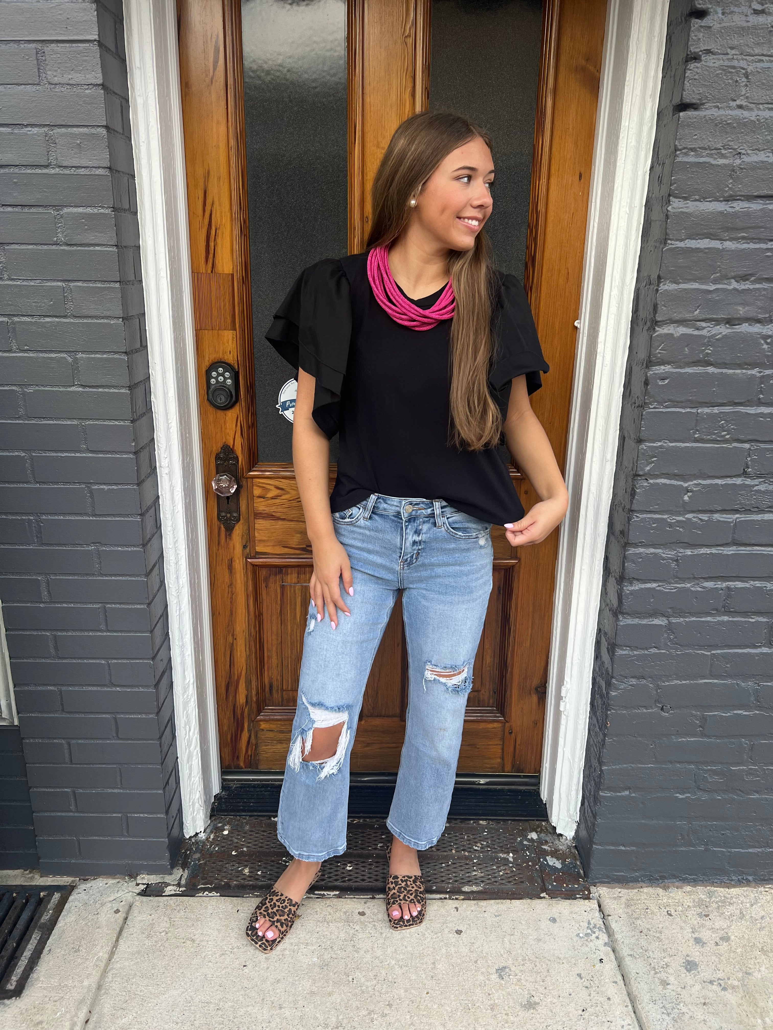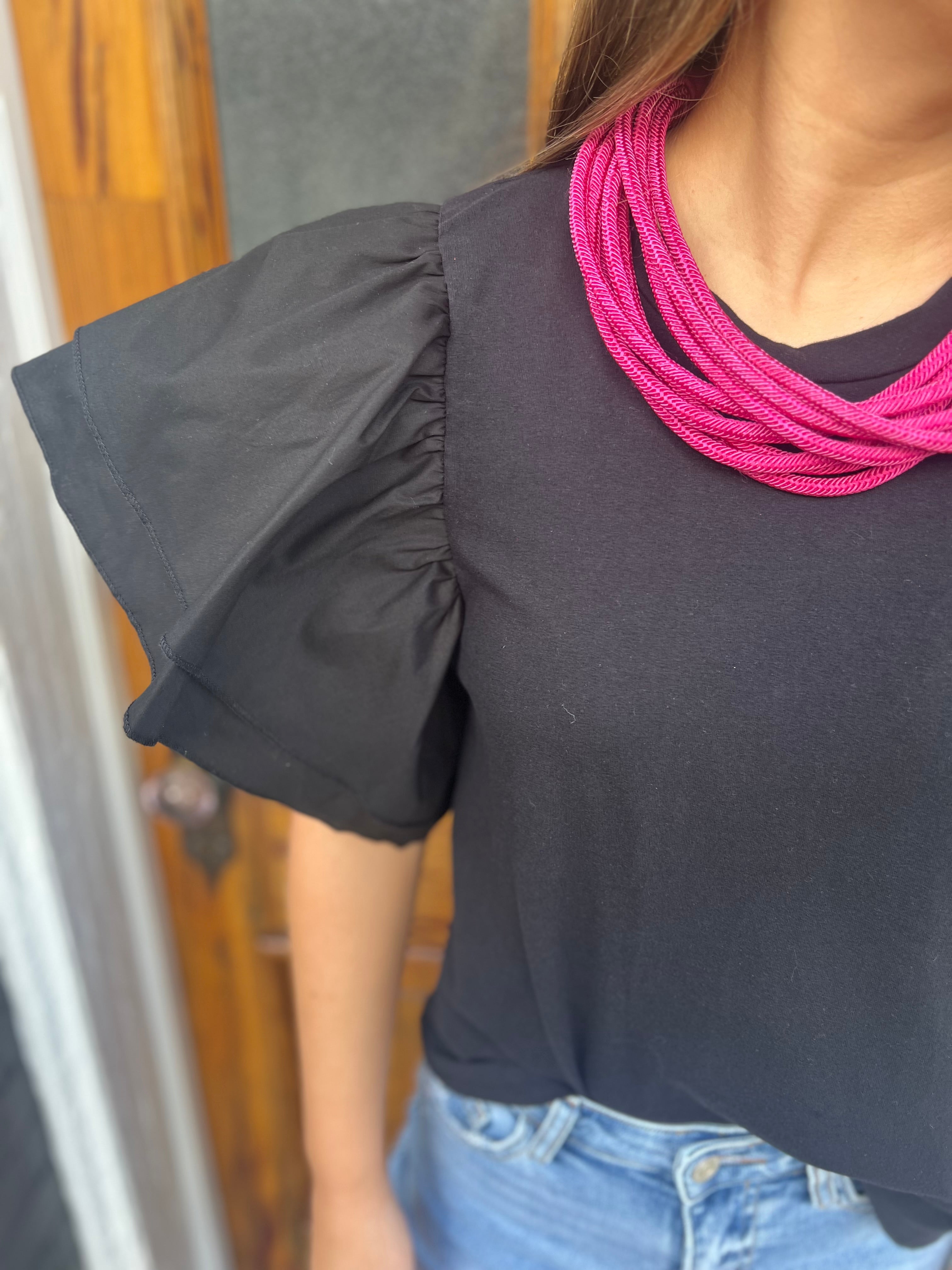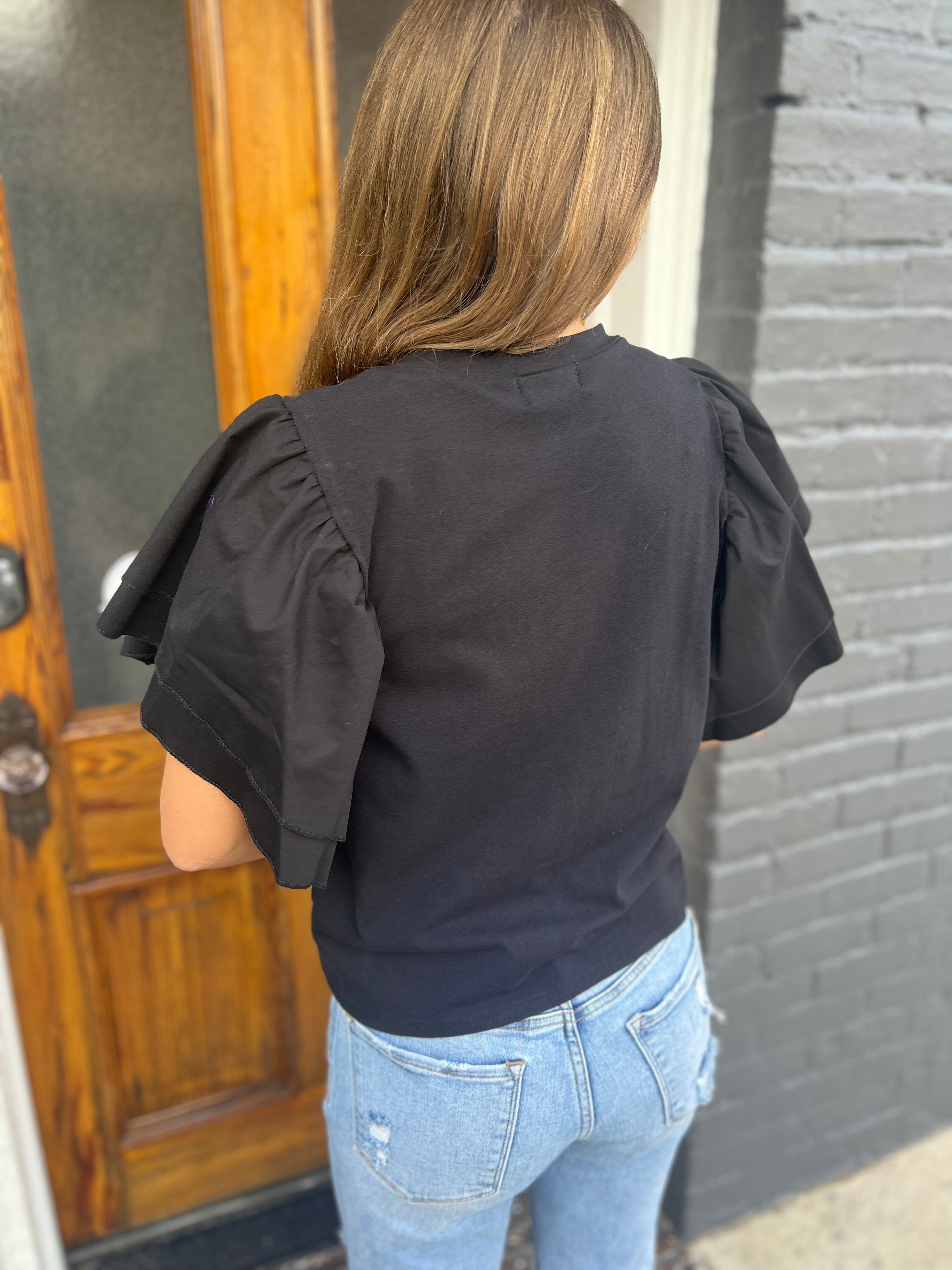 The Iris Blouse in Black features soft cotton with a touch of stretch for all-day comfort. Its short ruffle sleeves add a delicate, feminine flair, making it ideal for everyday wear, school, church, or work. Pair it with a cute necklace to effortlessly complete your look with subtle elegance.