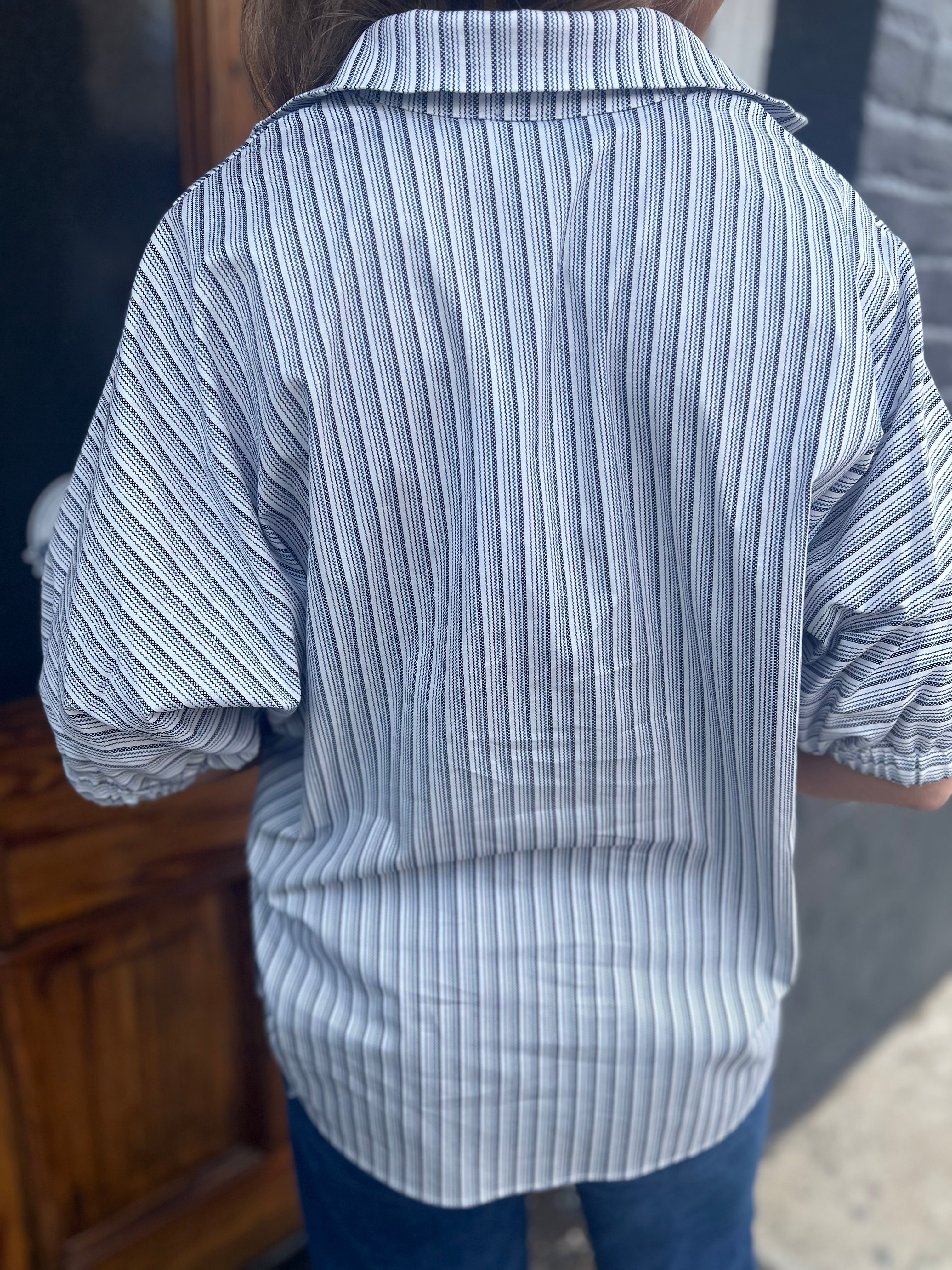 Elevate your wardrobe with the Sloan Blouse in Blue Bar Stripe. Featuring a chic stand collar and relaxed drop shoulder design, this short-sleeve, pull-on top blends comfort with a polished look. Perfect for work or school, it easily transitions from professional to casual settings. Crafted from 100% polyester, it offers effortless style and easy care. Dress it up or down to suit your day with confidence and ease.