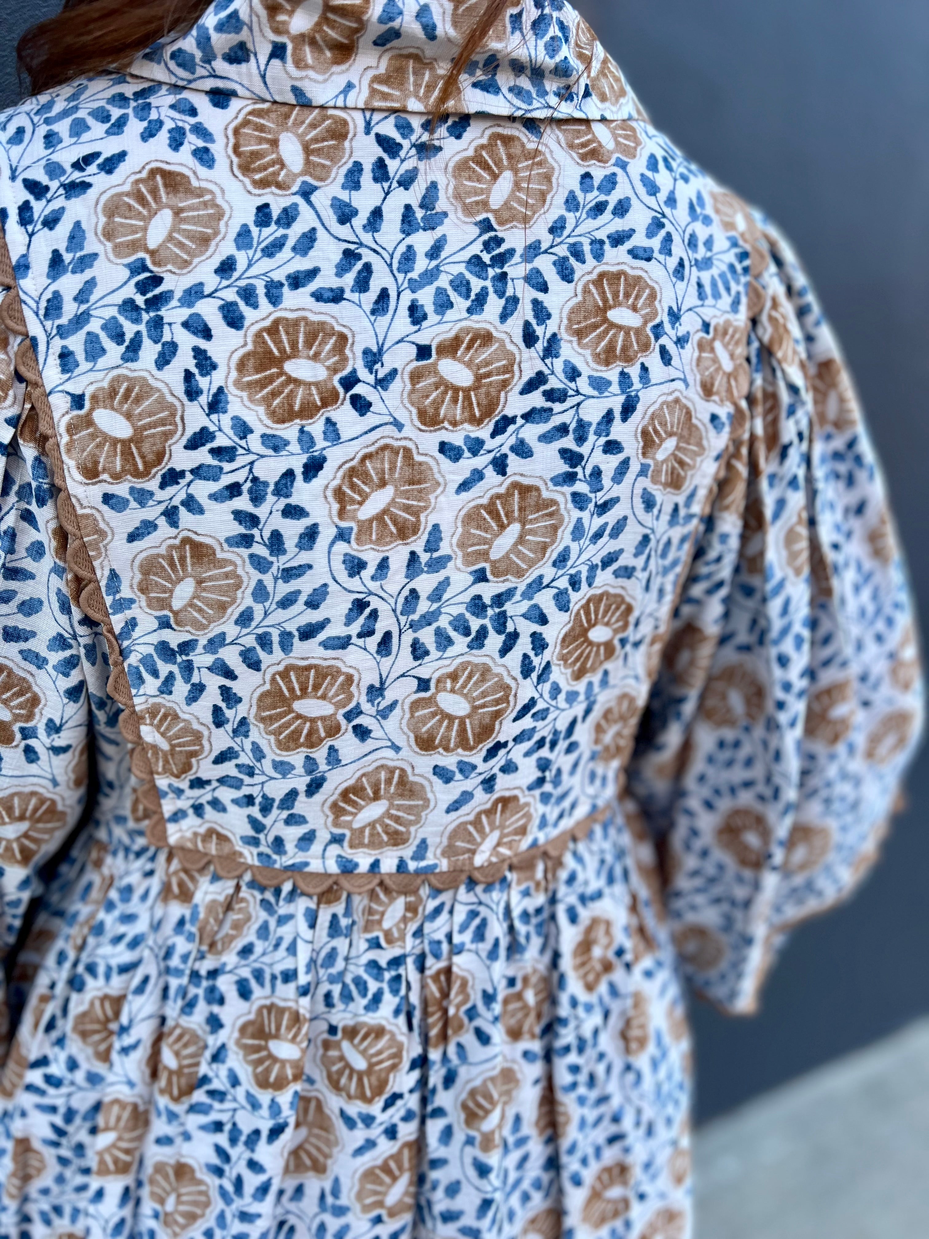 Embrace the changing season with The Chandler Blouse in Camel Mix. Featuring elegant 3/4 balloon sleeves and a flattering collar with a V neckline, this blouse is detailed with a unique square ric rac trim around the front and back bust. The cream background adorned with camel florals and blue leaves brings a fresh, nature-inspired look perfect for transitioning into fall. Stylish and comfortable, it’s an effortless way to refresh your wardrobe with seasonal charm.