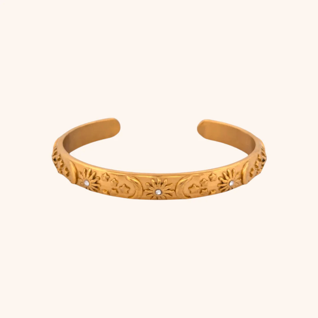 This elegant ECLIPSE CUFF by PRESSIE is crafted from gold and features raised solar designs. Complete the look with matching earrings. Elevate your style with this stunning accessory.