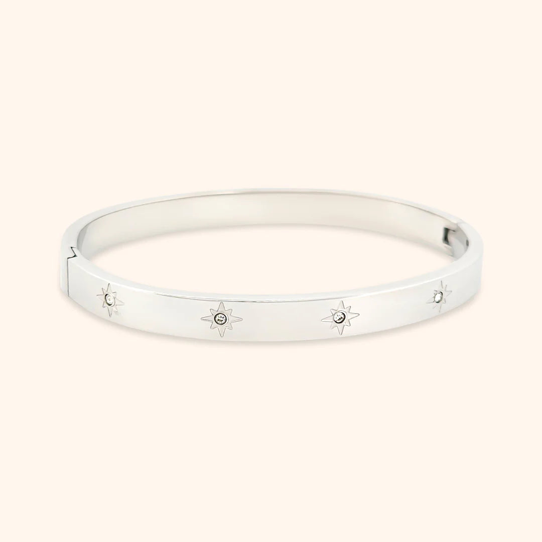 Embrace the galaxy with this stunning bangle by Pressie. Available in smooth gold or silver finish, the bracelet is adorned with etched stars and scattered crystals, adding a touch of sparkle to any outfit. The perfect accessory for any space enthusiast.