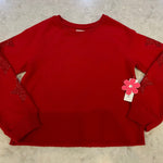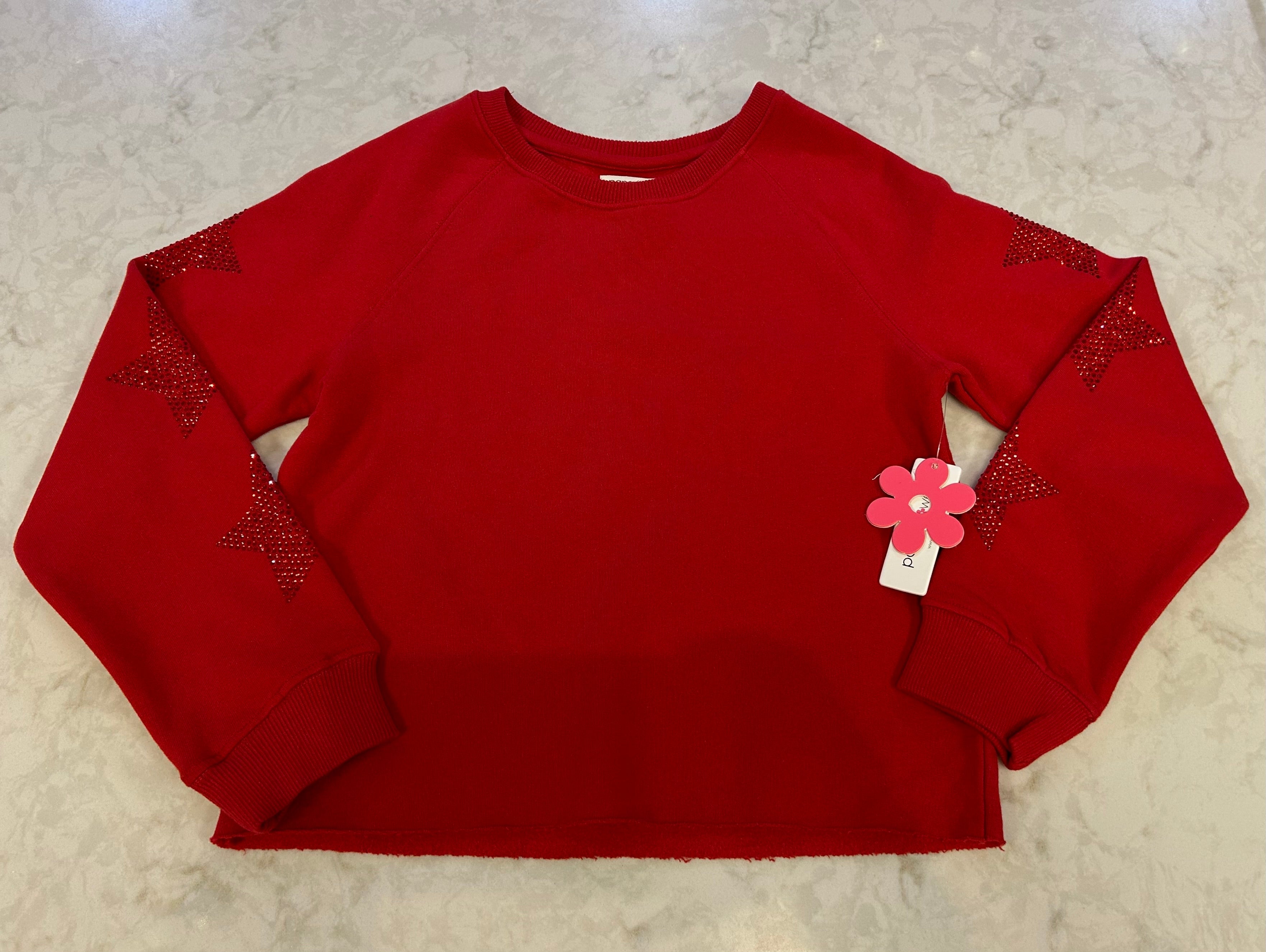 This cropped sweatshirt is a must-have for any fashion-forward girl! The vibrant red color and rhinestone stars down each arm make a bold statement, while the red on red rhinestones add extra sparkle. Elevate any outfit with this eye-catching and stylish piece!