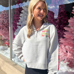 Celebrate the season in cozy style with this Girls Very Merry Sweatshirt in Heather Gray. Crafted from soft fleece, it features festive embroidered text 'Very Merry Always Bright' on the front and standout chenille embroidery of 'Merry' on the back and sleeves. This sweatshirt combines warmth with playful holiday charm, making it perfect for tween girls to stay comfortable and spirited all season long.