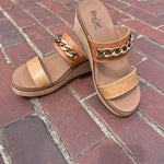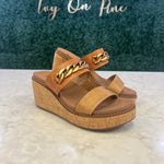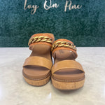 Step into effortless style with the Nightcap Wedge in Cognac by Corkys. This chic slip-on features a sleek faux leather upper and a comfortable 2.5-inch wedge heel that adds height without sacrificing stability. The bold chunky chain detail on the top strap brings a modern edge, making it perfect for dressing up or down. Lightweight and easy to wear, these wedges are ideal for nights out, romantic dinners, or any occasion where you want to look polished and feel confident. Elevate your wardrobe with a versatile shoe that combines comfort and sophistication.