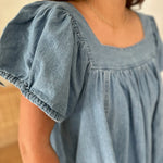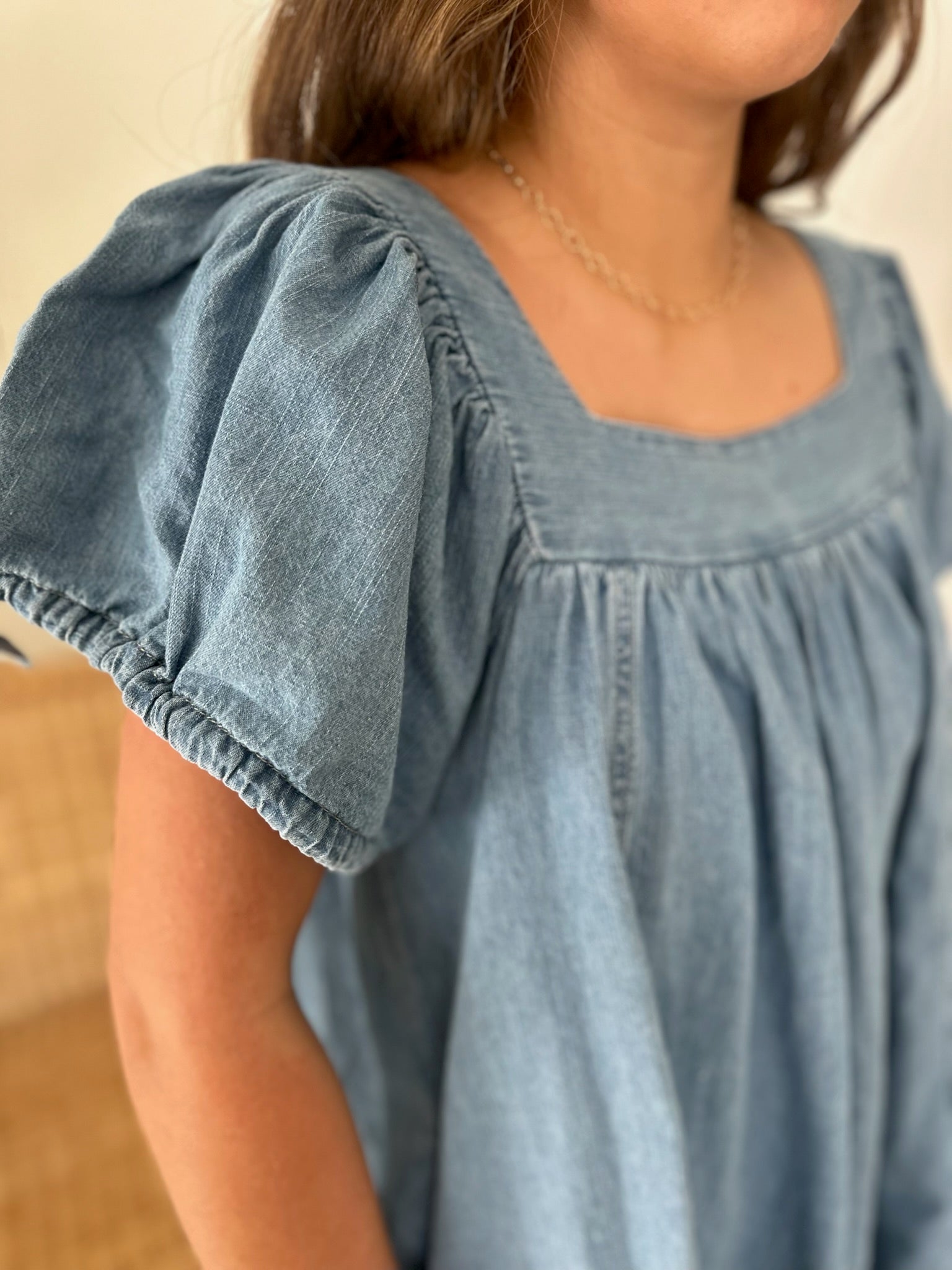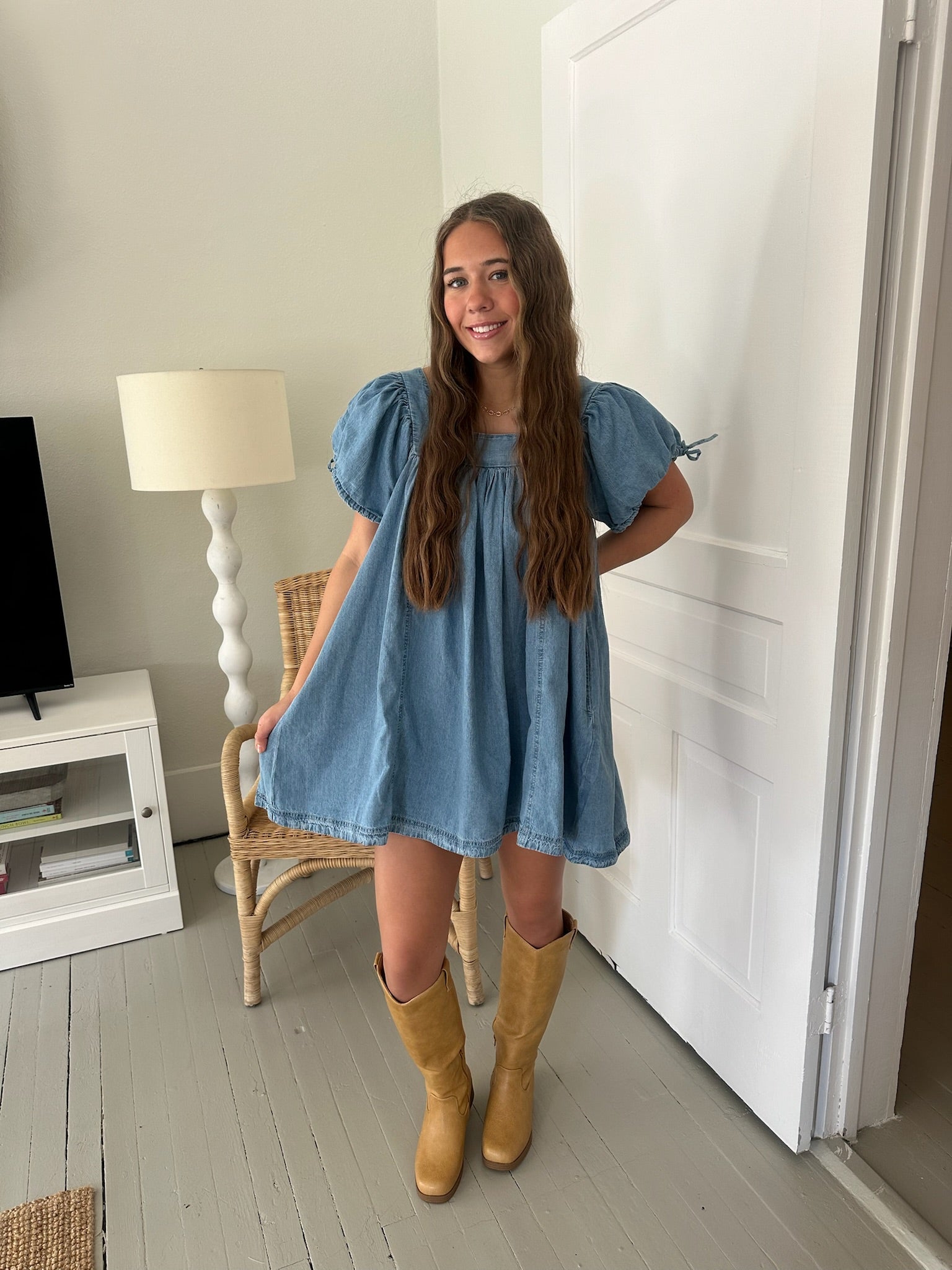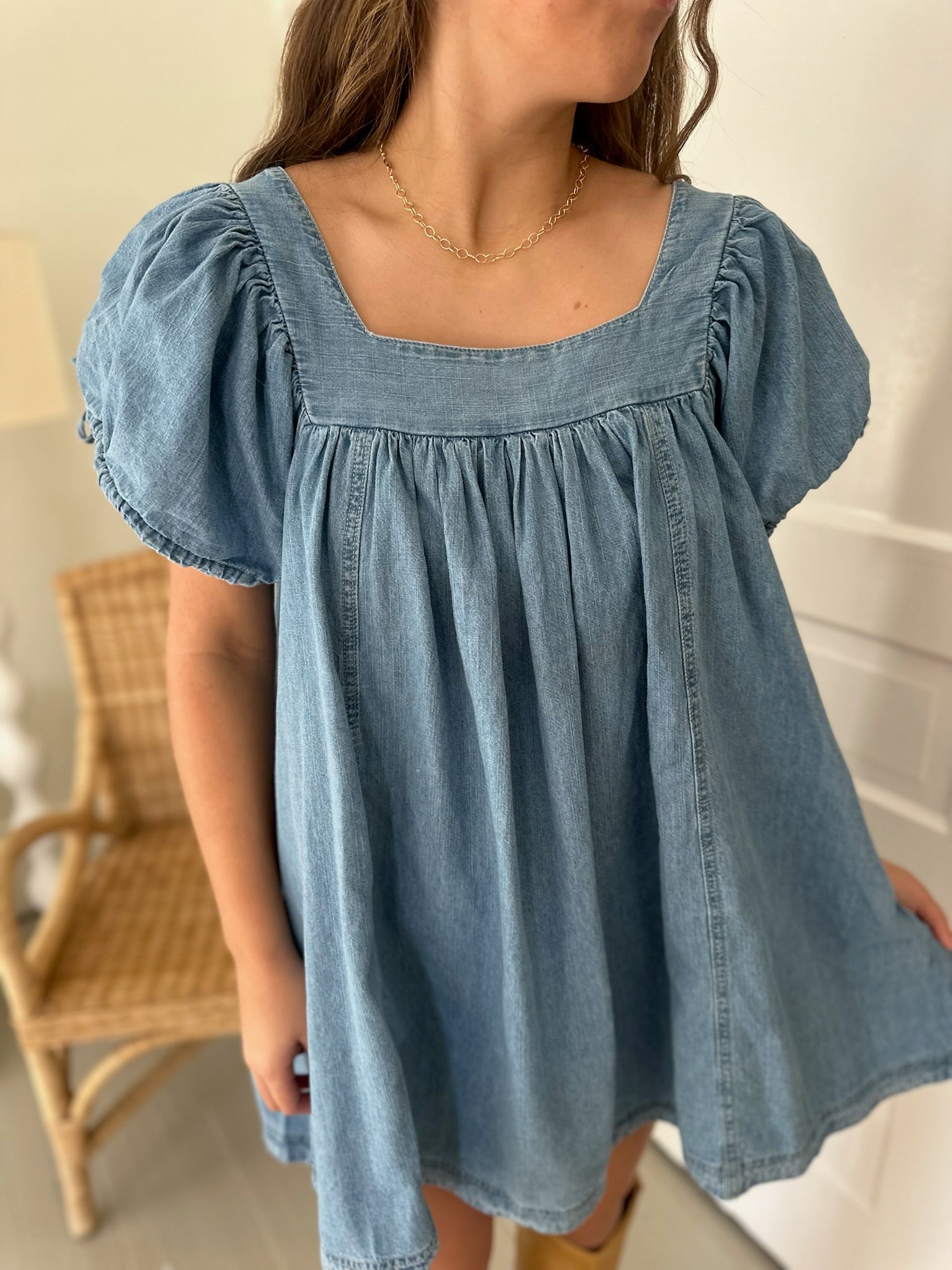Effortlessly chic and undeniably versatile, this light mineral washed denim mini dress combines vintage charm with modern comfort. The flattering square neckline and romantic puff sleeves with delicate tie details create an instantly eye-catching silhouette, while soft gathered pleats and a relaxed A-line cut ensure all-day wearability. Practical side hip pockets add functionality to the design. Perfect for casual outings, weekend adventures, or dressed-up occasions, this dress transitions seamlessly from season to season and pairs beautifully with sneakers, boots, or sandals.