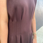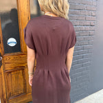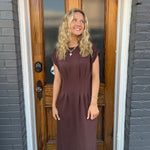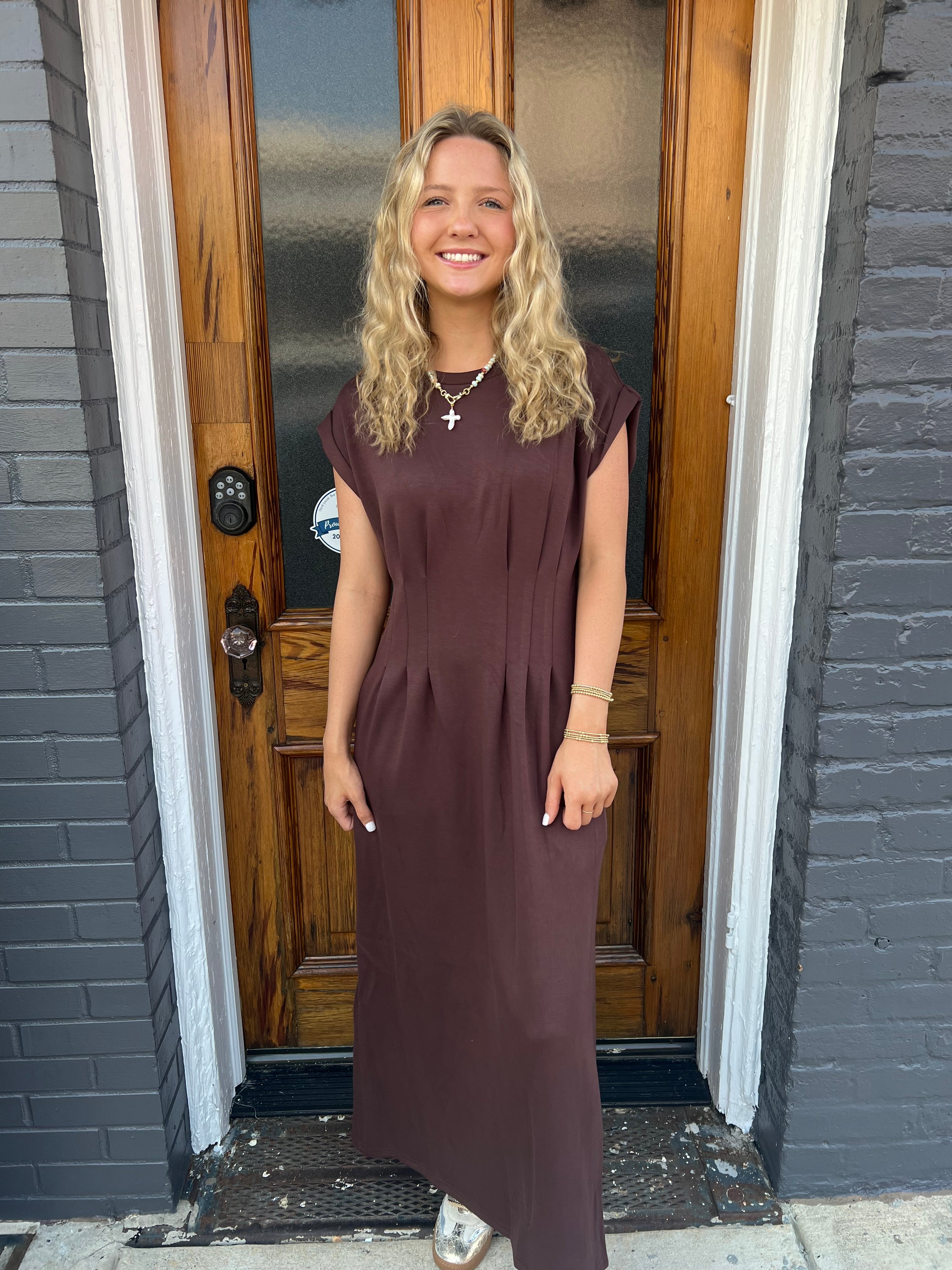 The Kimber Dress in Brown offers a flattering midi silhouette with solid cap sleeves and an elegant round neckline. Its front and back pleated bodice enhances shape and comfort, while practical side pockets add everyday convenience. Crafted from a lightweight, non-sheer knit fabric and unlined for breathable wear, this dress combines style and ease, making it perfect for any occasion.