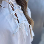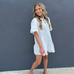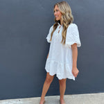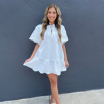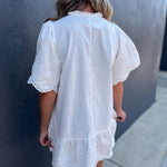 The Breleigh Mini Dress in white offers embroidered details and ribbon ties for a stylish touch. Made from breathable 100% cotton with a comfortable lining, it’s perfect for warm days or special events.