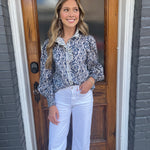 The Morning Blues Top features a floral print with smocked cuffs and a striped ruffle neck for a stylish look. Lightweight and breathable, it’s easy to wear with a button-front closure, perfect for adding a fresh touch to your outfit.