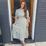 Elevate your wardrobe with this short-sleeve woven midi dress in a chic olive stripe. Featuring a comfortable elastic waistband and handy pockets, it offers both style and practicality. The V-neck with hidden button closures adds a sleek, polished look perfect for any occasion.