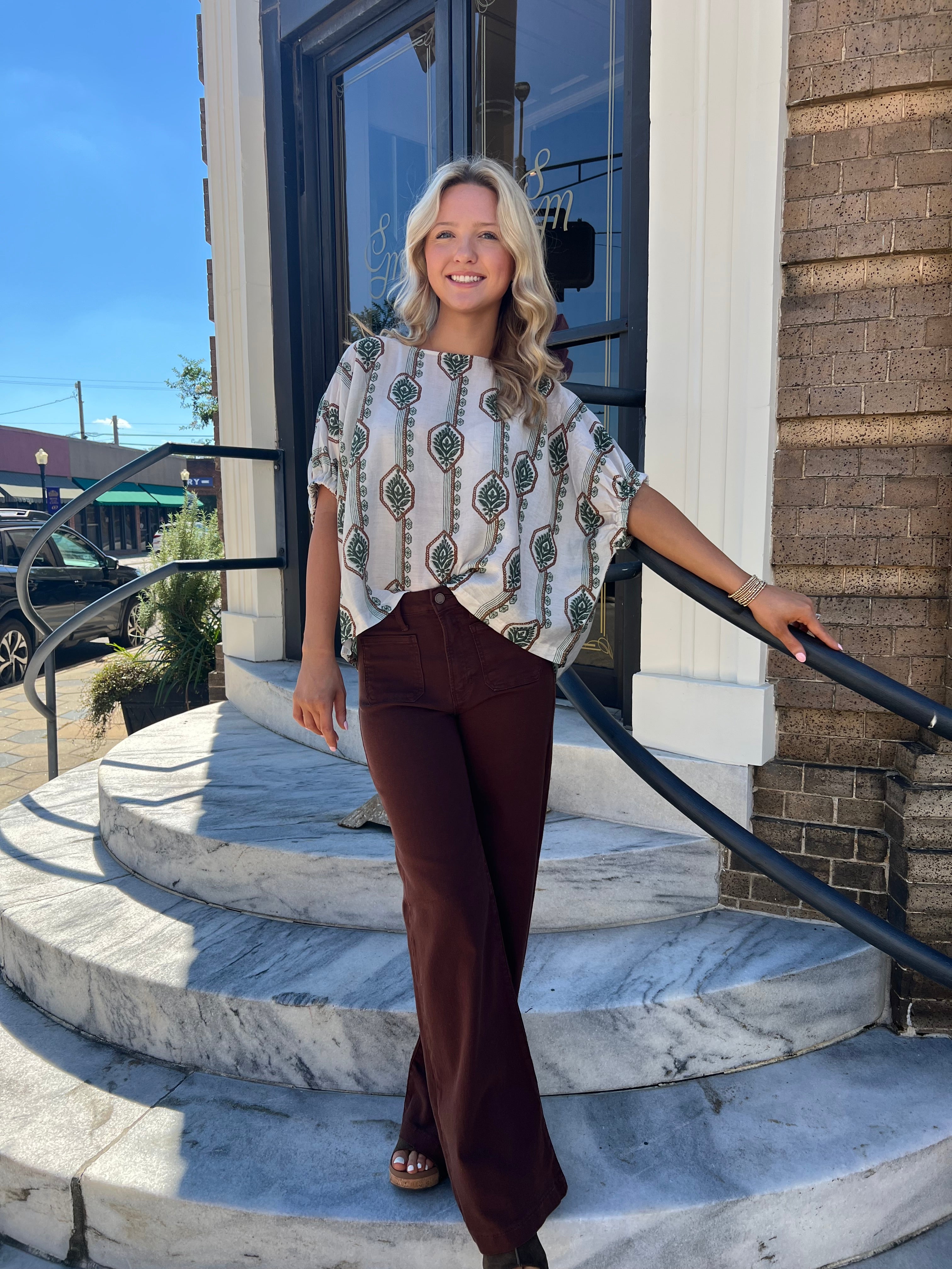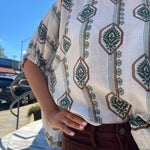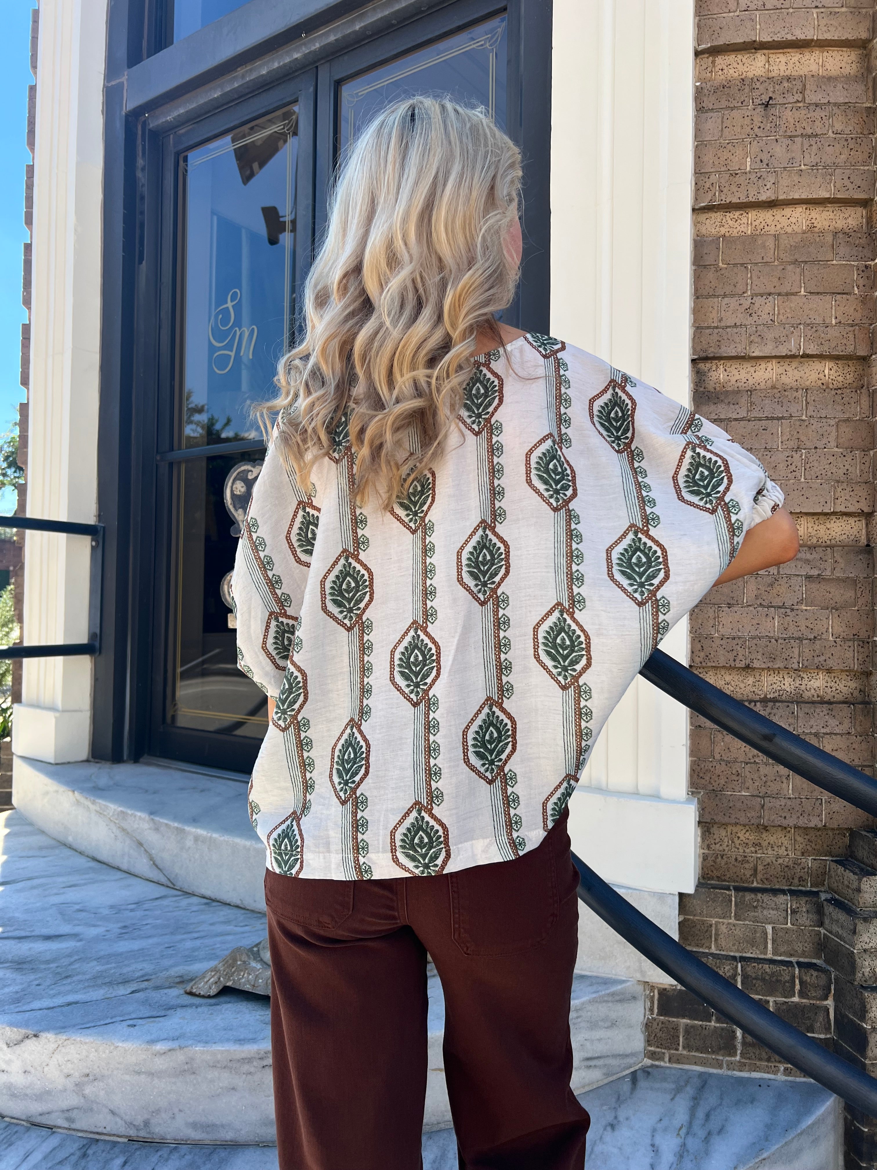 Elevate your wardrobe with the Geometric Olive Garden Top, featuring a charming flower pattern that adds a touch of nature-inspired elegance. Its boat neck design offers a flattering neckline, while the dolman short sleeves provide comfort and effortless style. Perfect for any occasion, this blouse combines unique geometric details with a relaxed fit to keep you looking fresh and fashionable all day long.