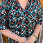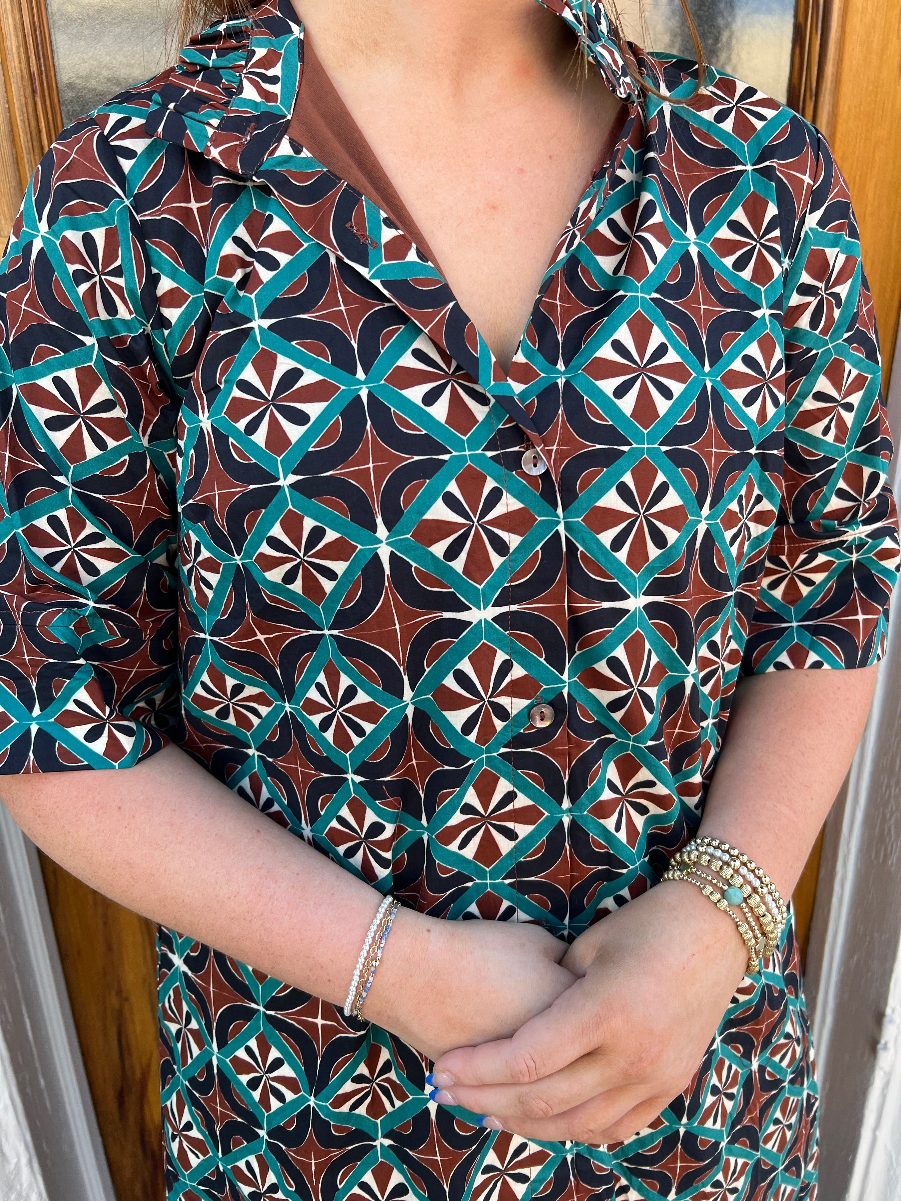 Elevate your wardrobe with the Geometric Shirt Dress in Brown, a chic midi dress featuring a bold geometric print and a flattering button-front closure. Designed with short sleeves and side pockets, it combines style with everyday practicality. The lightweight, woven fabric feels comfortable all day, while the lining ensures complete opacity. Perfect for warm days or layering, this versatile dress offers a polished look that transitions seamlessly from casual outings to more refined occasions.
