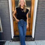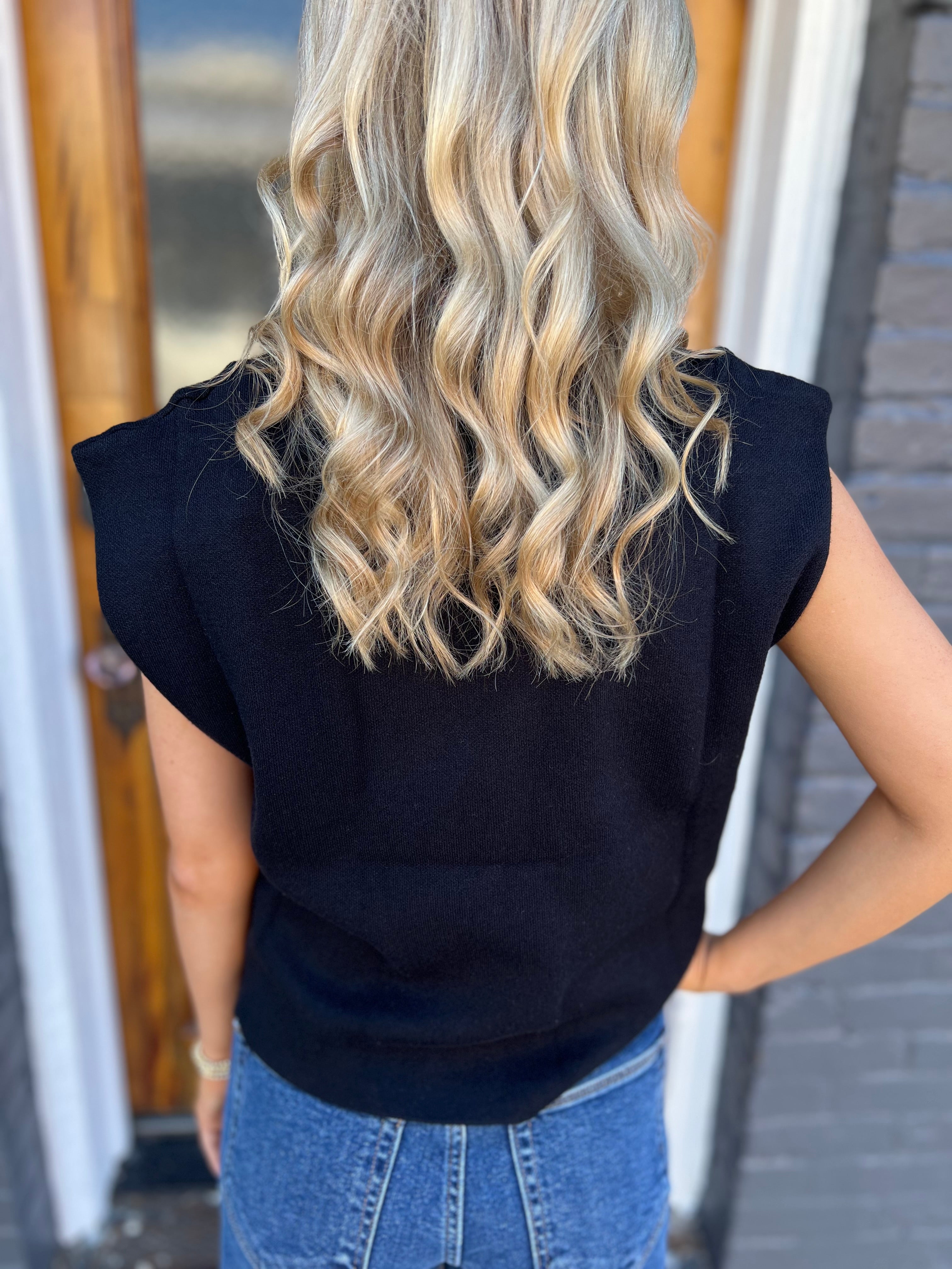 The Black Cap Sleeve Sweater offers a sleek, modern silhouette with its ribbed crew neckline and lightly structured cap sleeves. Designed with a relaxed, slightly boxy fit, this sleeveless knit top effortlessly blends comfort and sophistication, making it perfect for polished everyday wear or layering under jackets. Elevate your wardrobe with this versatile piece that balances subtle detail and timeless style.