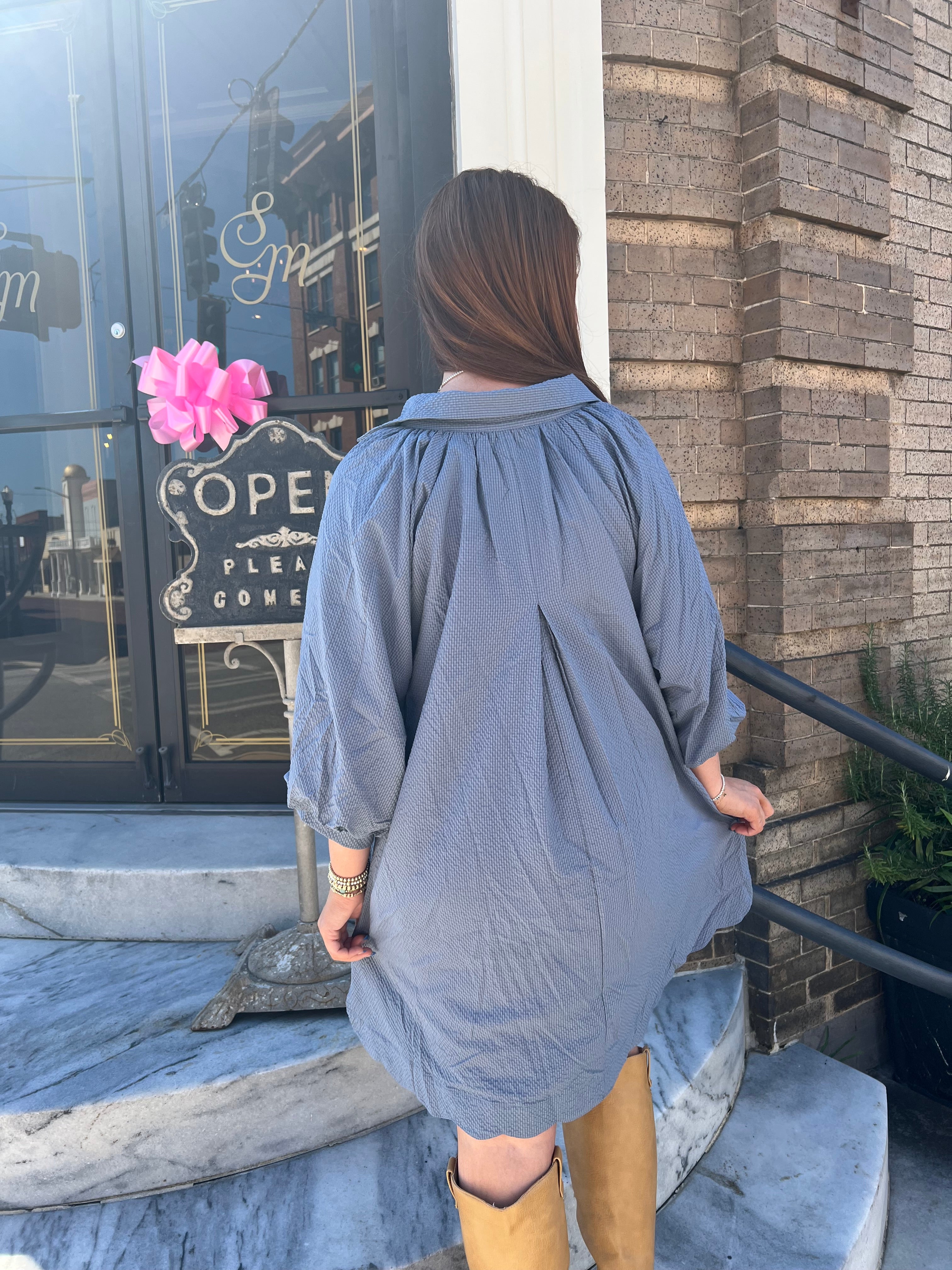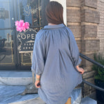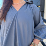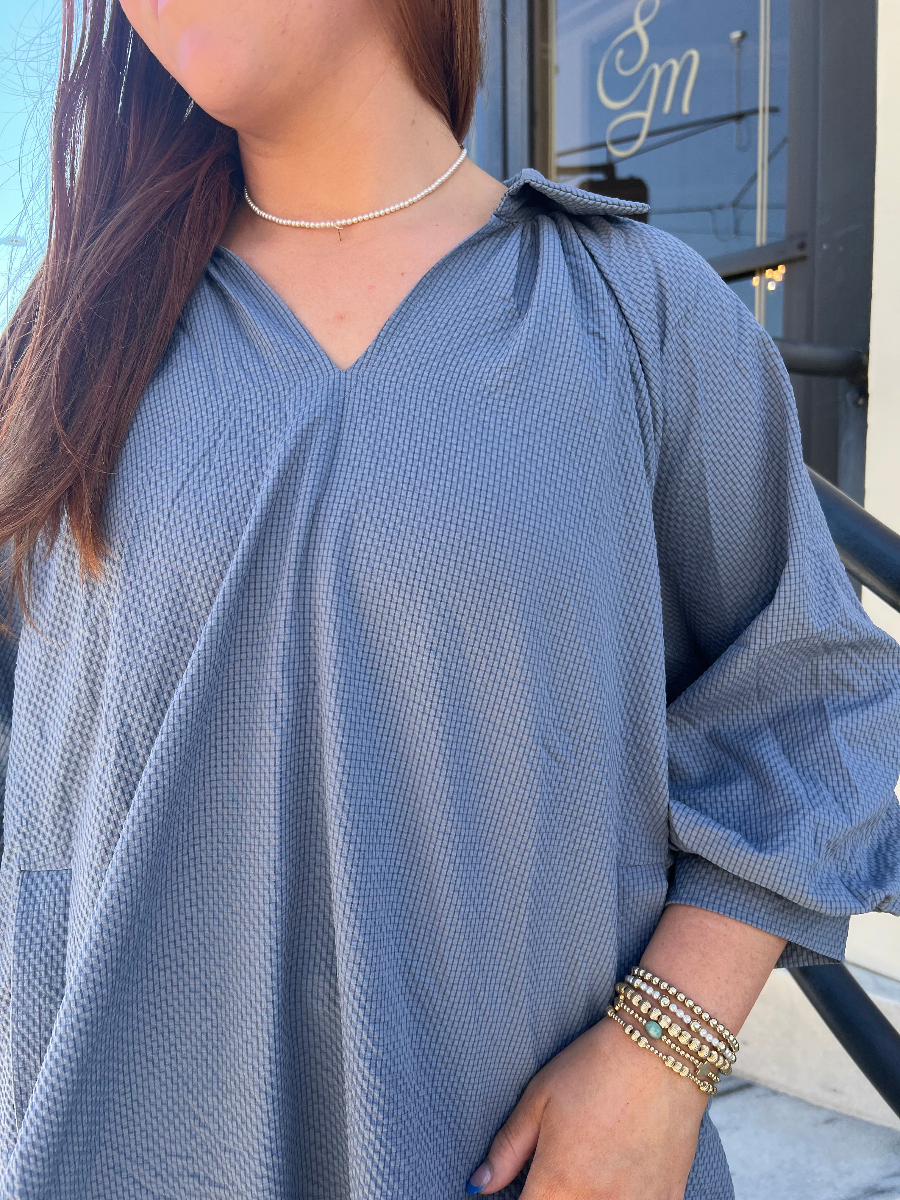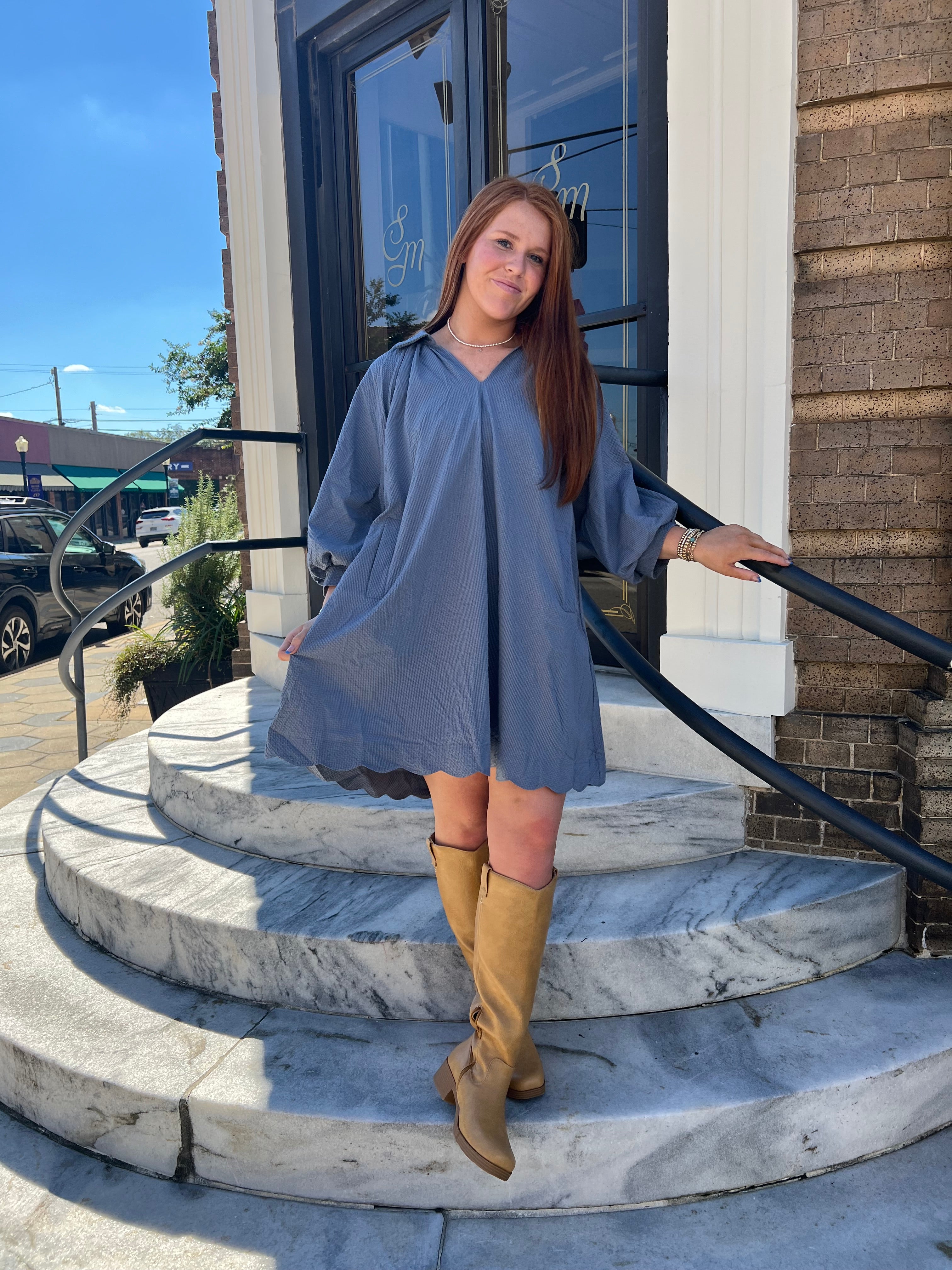 Elevate your style with The Kate Dress in Steel Blue. This elegant split V-neck dress features charming 3/4 bubble sleeves and delicate scalloped details for a sophisticated touch. The flat collar enhances the neckline, while convenient side pockets add practicality without sacrificing style. Fully lined for comfort, this dress effortlessly blends modern design with timeless appeal, making it perfect for both casual and dressy occasions.