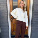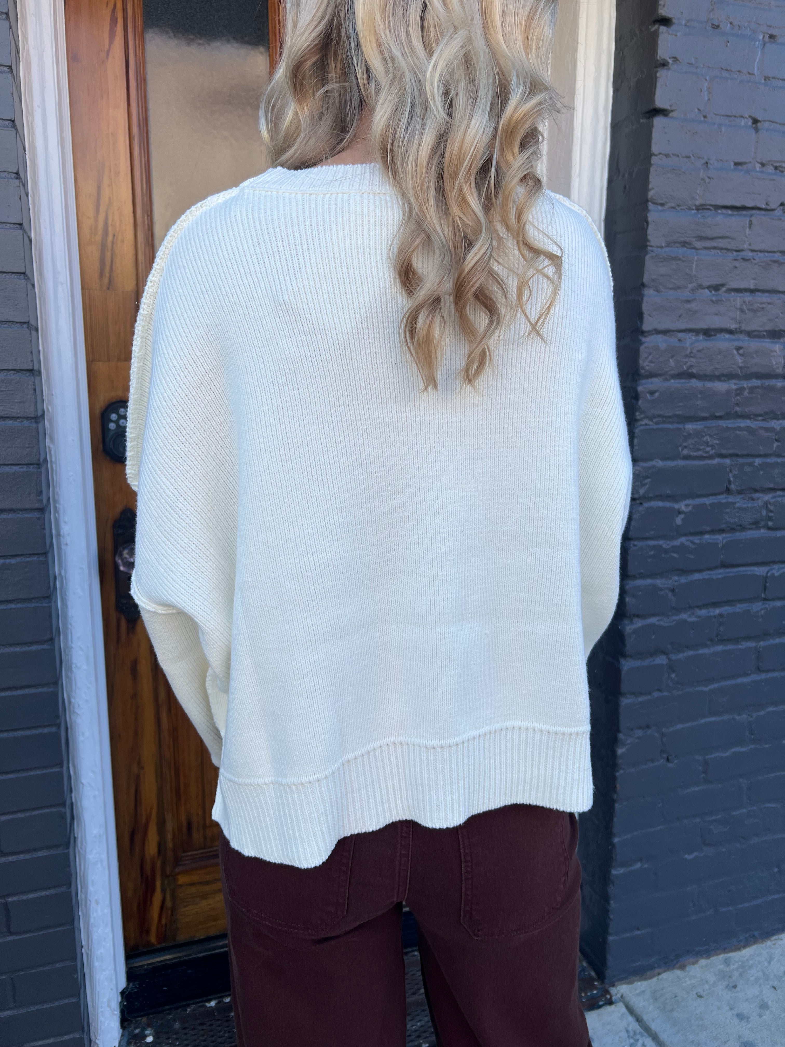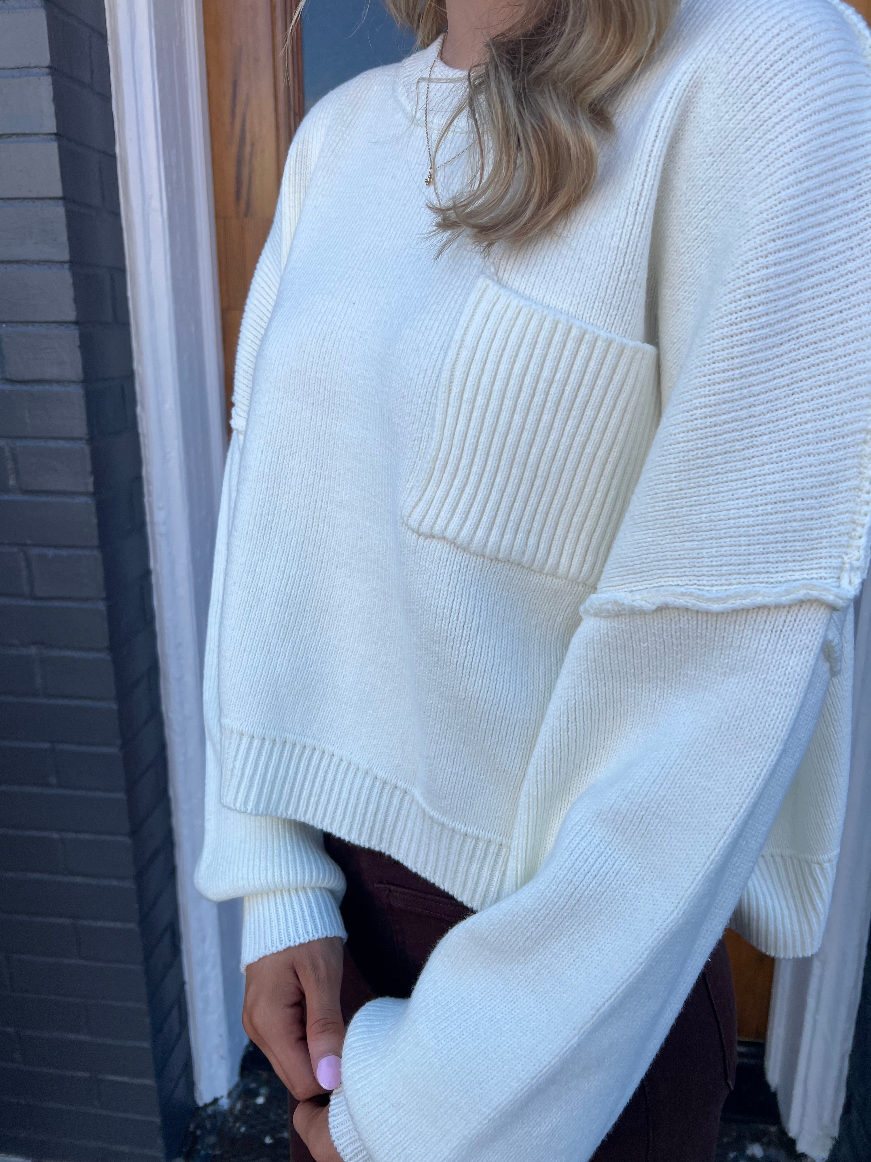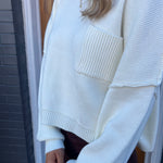 The Mattie Sweater in Cream blends comfort with effortless style. Its long sleeves and cropped fit create a modern silhouette, while dropped shoulders and a relaxed shape ensure all-day ease. Contrast ribbed details on the chest pocket and sleeves add subtle texture, and the raw edge hem completes this elevated essential. Perfect for layering or wearing on its own, this sweater is a versatile addition to your wardrobe.