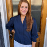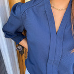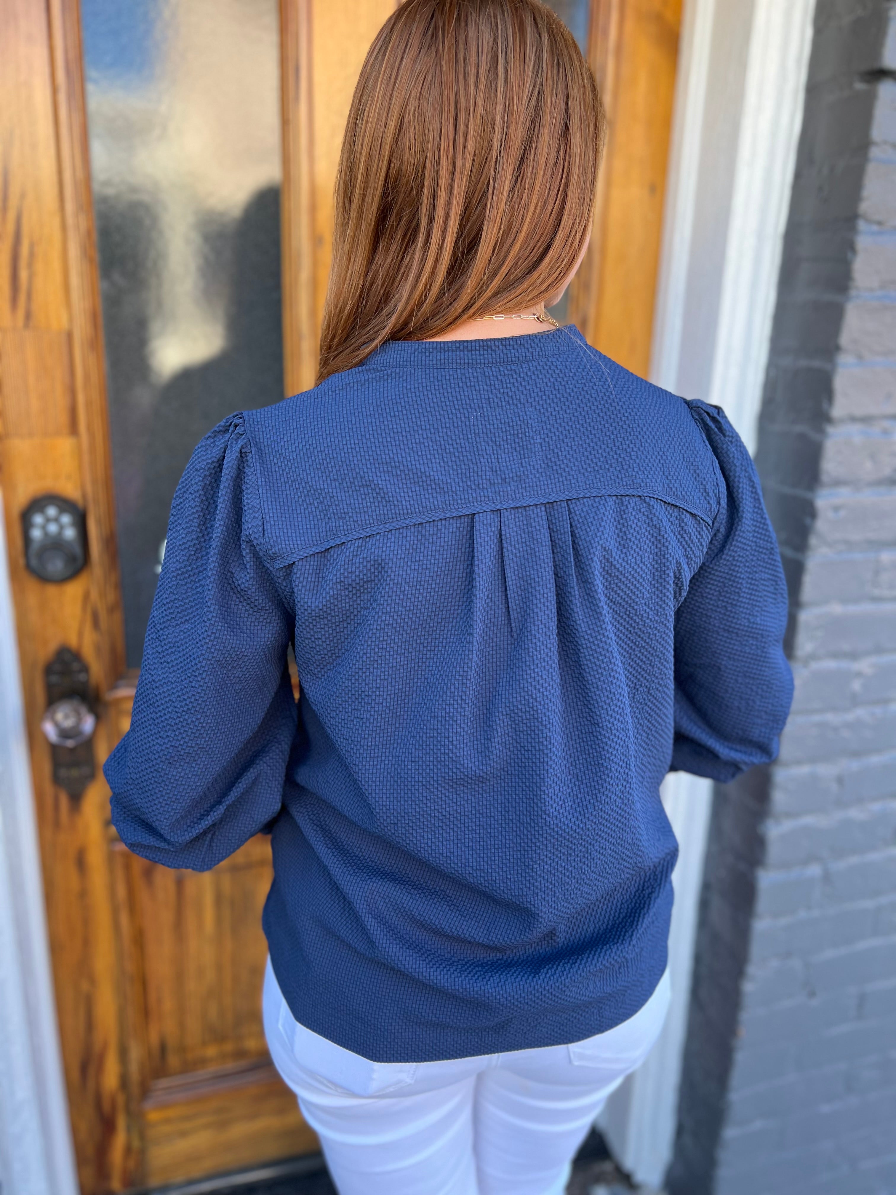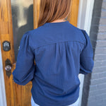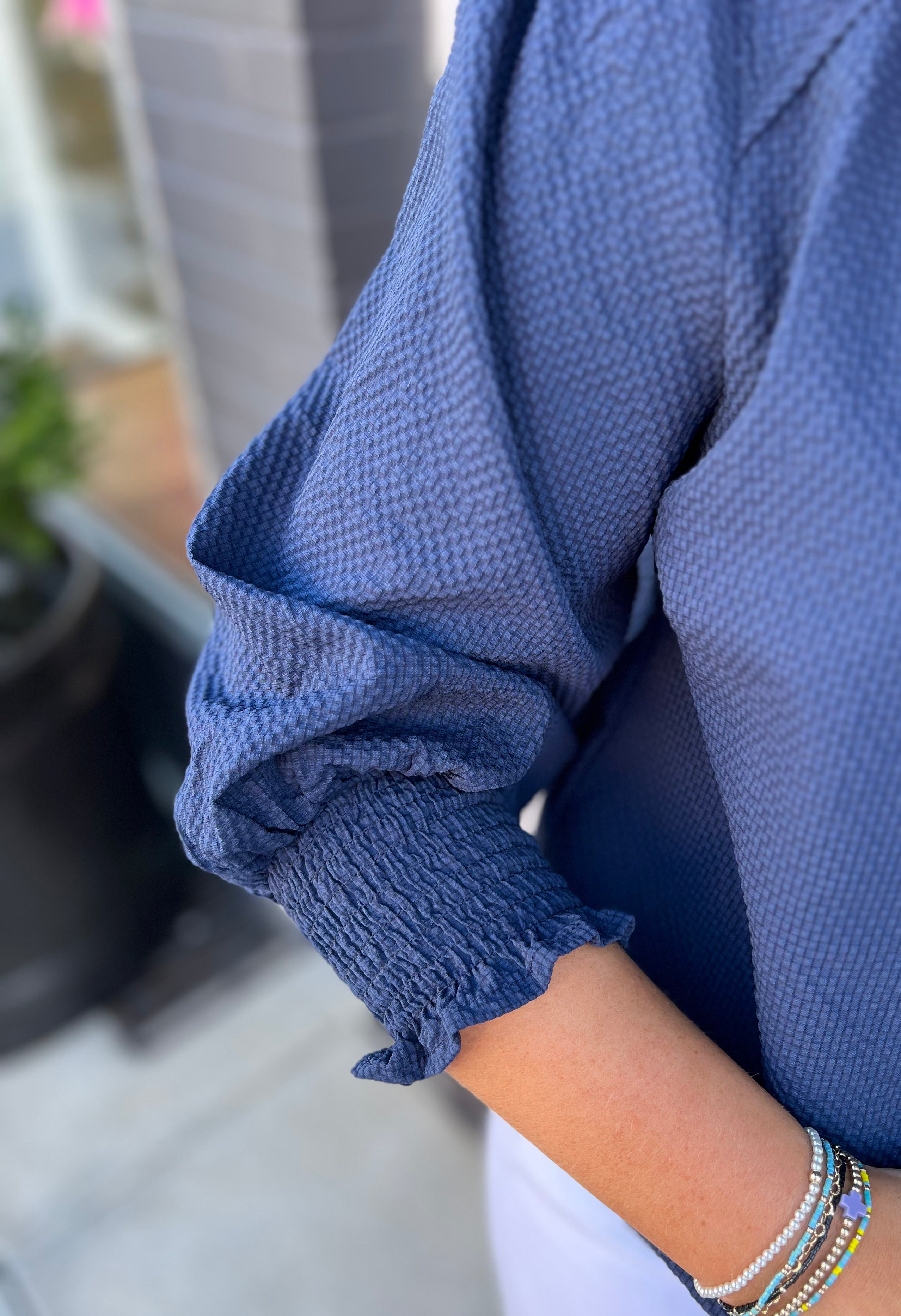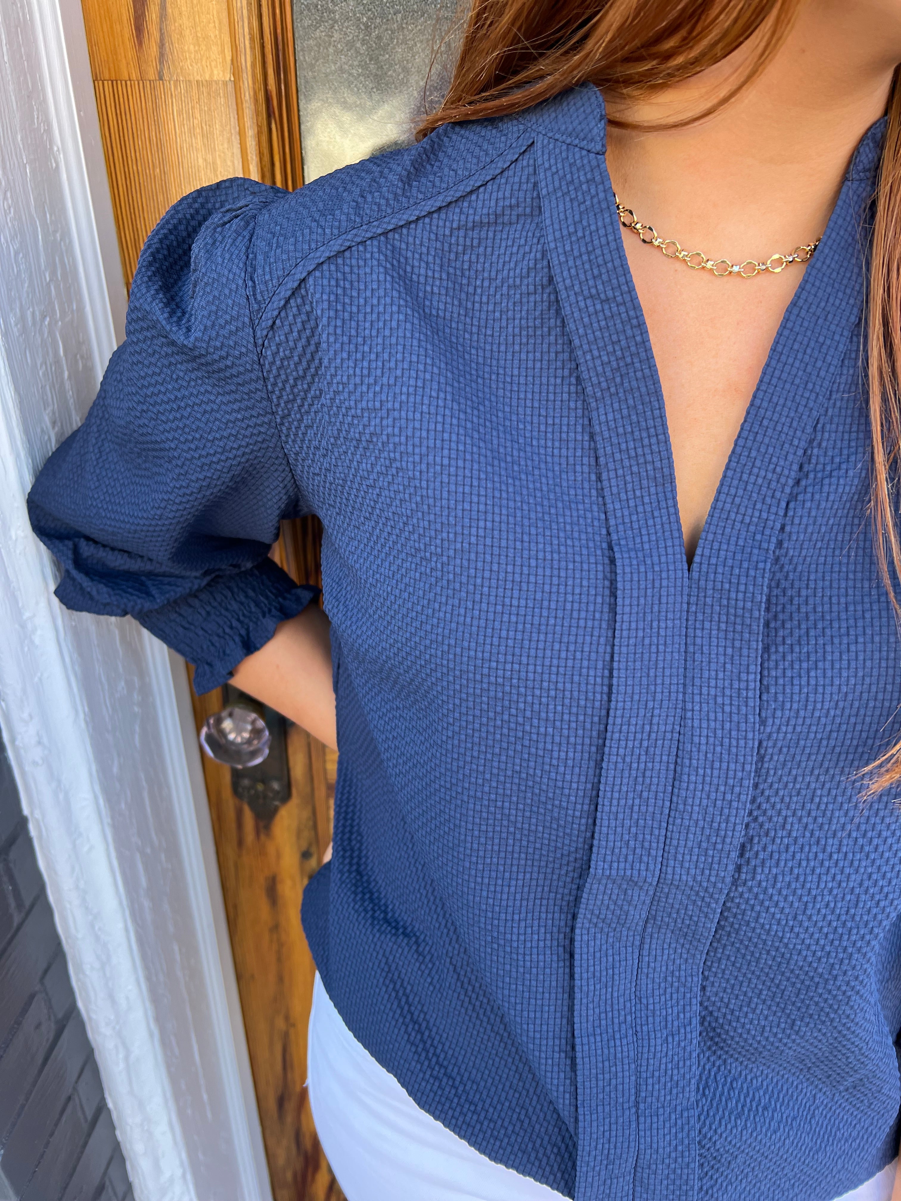 Elevate your wardrobe with the Navy Jeanie Blouse, crafted from textured woven fabric for subtle dimension and style. Its flattering V-neckline and relaxed, flowy fit offer effortless comfort and a chic silhouette. Accented with delicate piping and smocked cuffs, this blouse brings refined detail without feeling restrictive. Unlined for breathable wear, it’s perfect for day-to-night versatility.