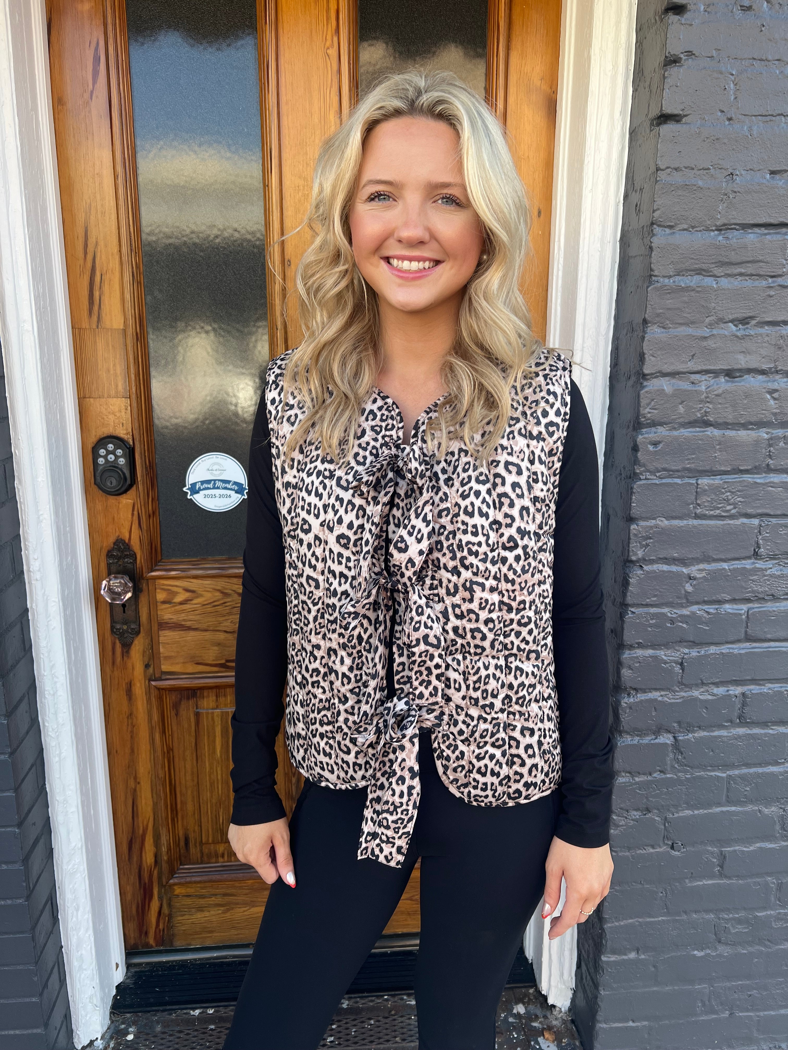 Indulge your wild side with our FOR THE LOVE OF LEOPARD vest. Featuring a striking animal print and quilted design, this vest is perfect for adding a touch of fierce style to any outfit. The U-neck and front 3-bow tie closure add a unique and charming touch. And with its non-sheer, lightweight material, it's both stylish and practical. Bring a sense of adventure to your wardrobe with FOR THE LOVE OF LEOPARD!