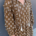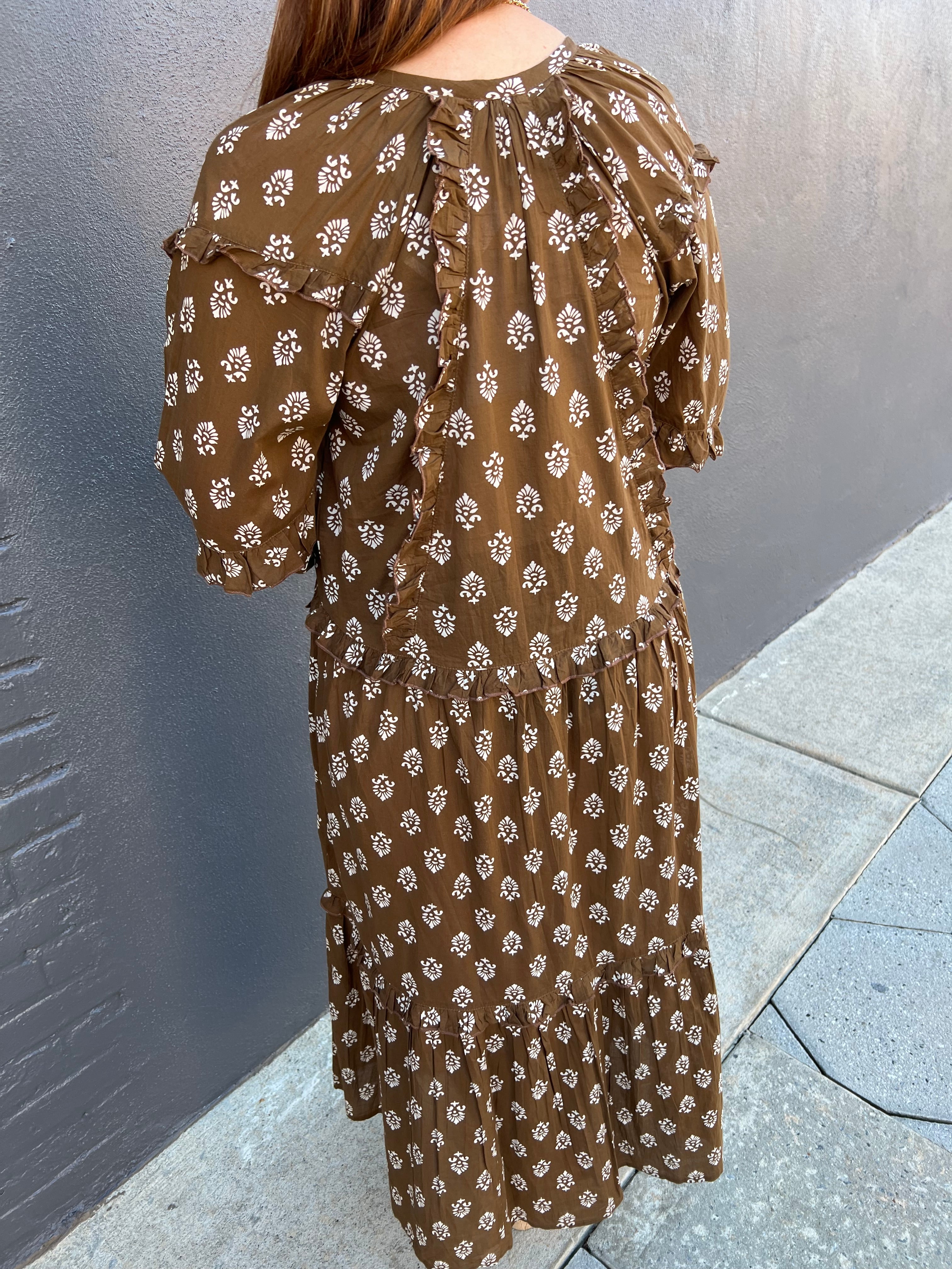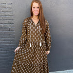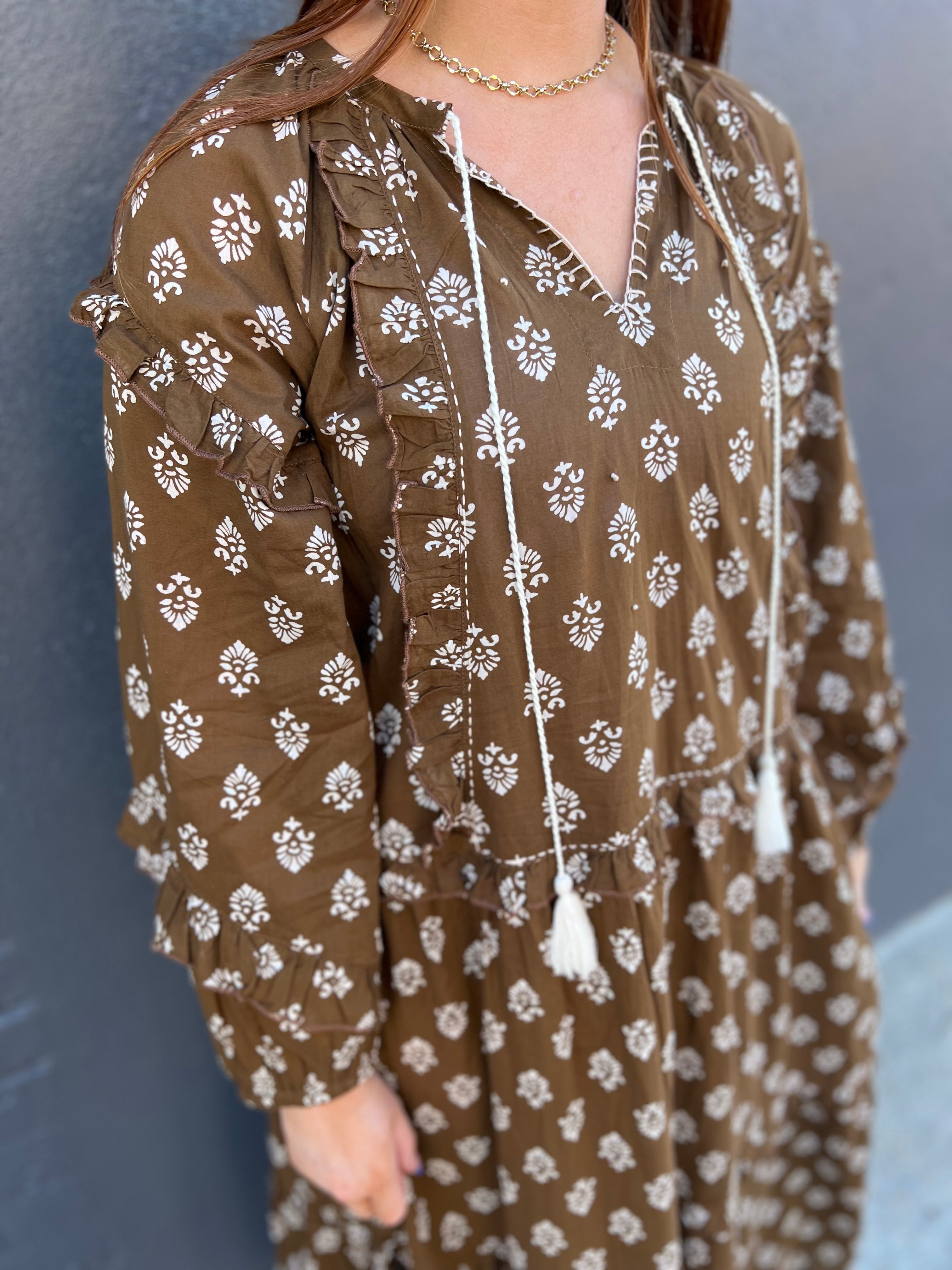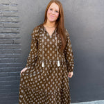 Elevate your wardrobe with the Hubbard Maxi Dress in Brown, crafted from lightweight cotton cambric for all-day comfort. This elegant maxi features a flattering V-neck with charming tassel ties, delicate contrast blanket stitching, and intricate French knot detailing on the bodice, adding subtle sophistication. With a floor-grazing length of approximately 52” on size small, it offers a graceful silhouette perfect for any occasion. Embrace effortless style and breathable fabric in one stunning dress.