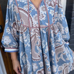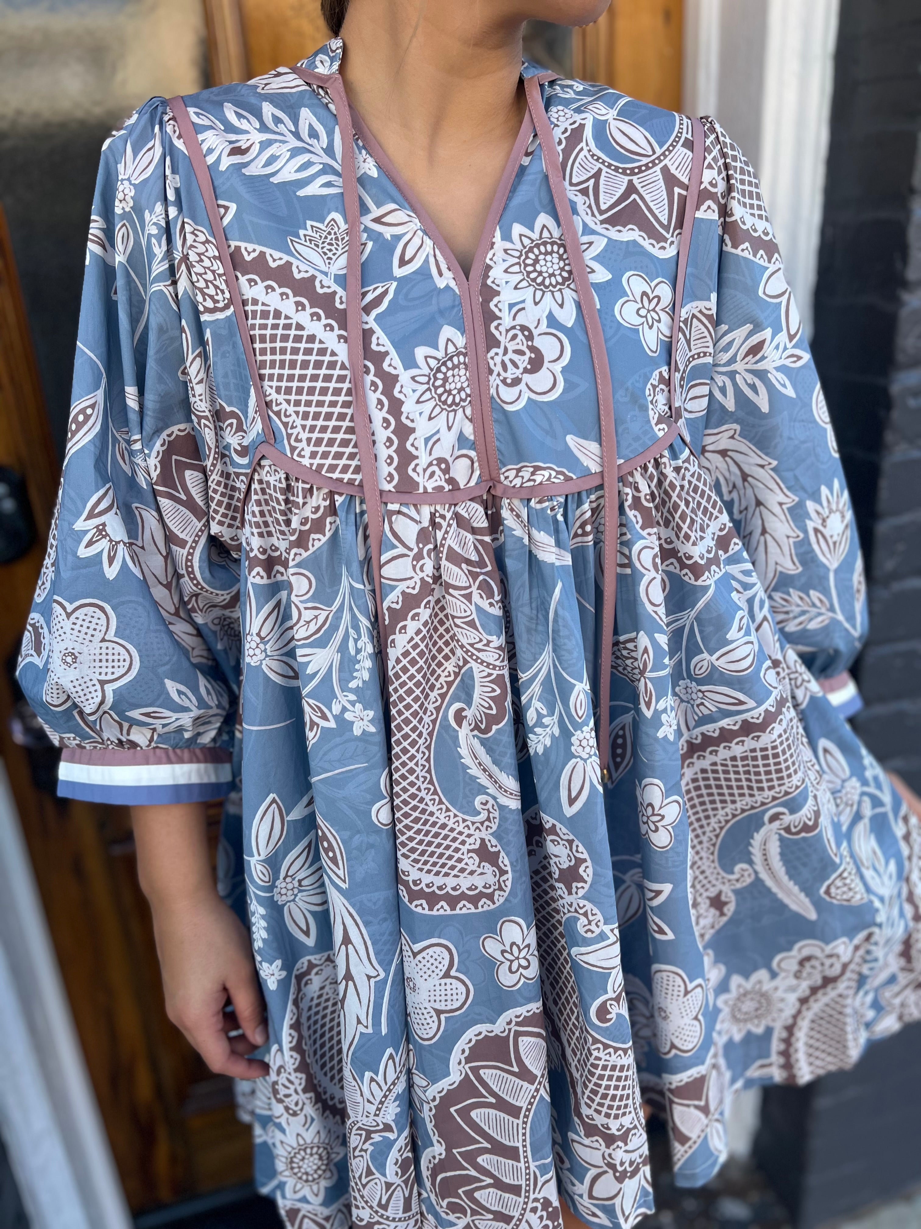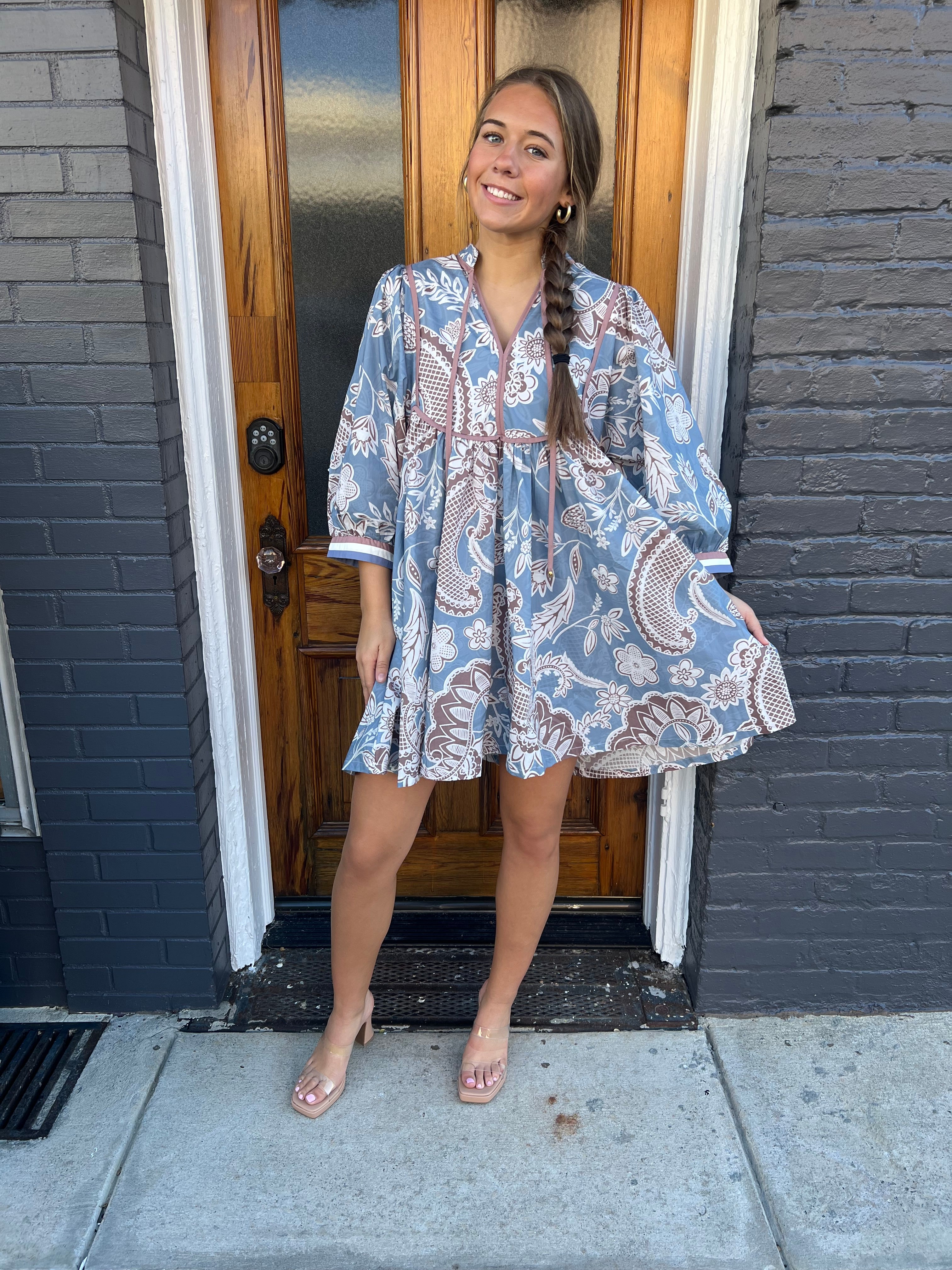 The Moroney Mini Dress in Dusty Blue features a flattering V-neck with a bow tie, 3/4 sleeves, and a floral design. Lined for comfort and equipped with pockets, its mini length makes it perfect for any occasion.