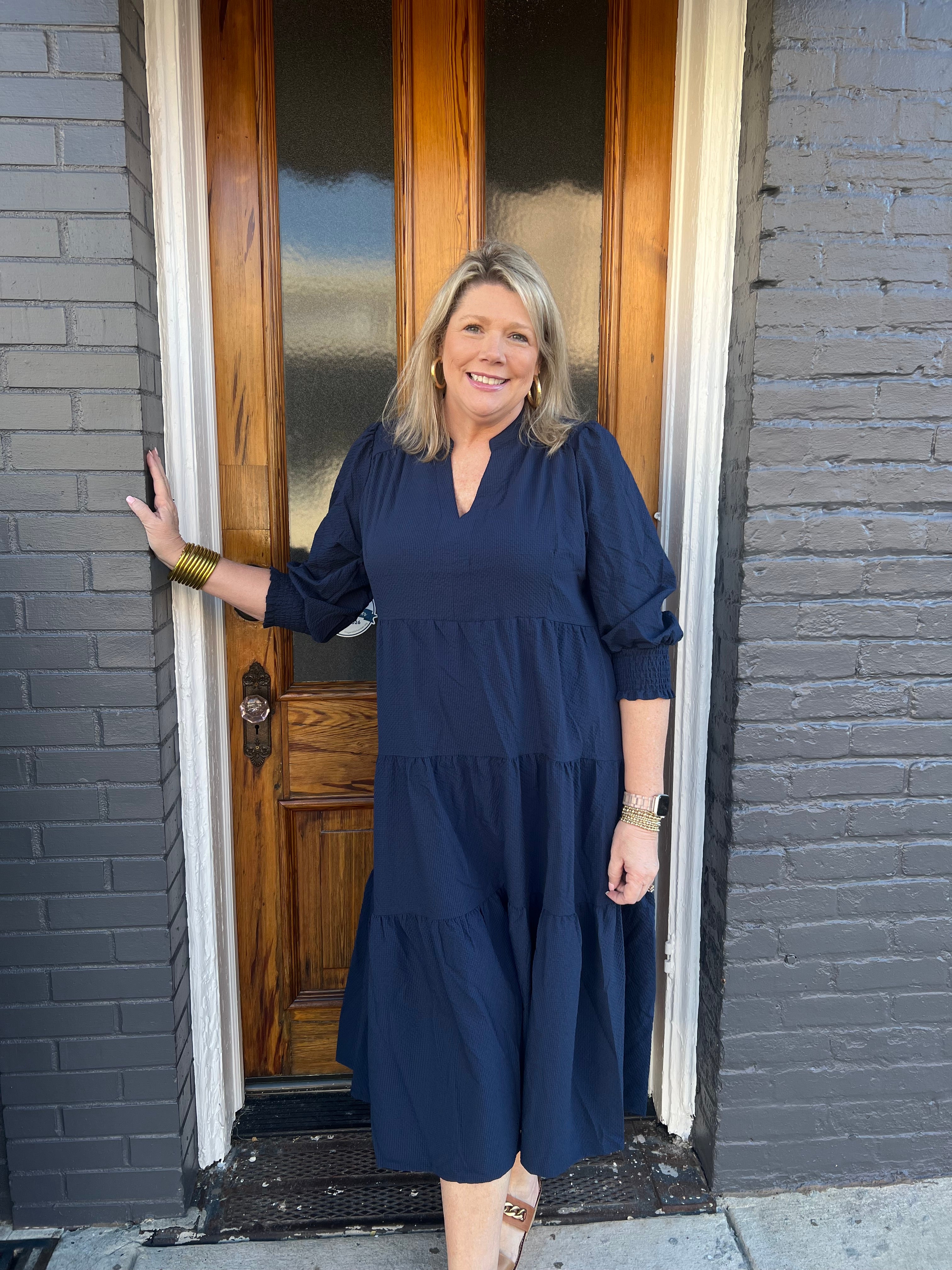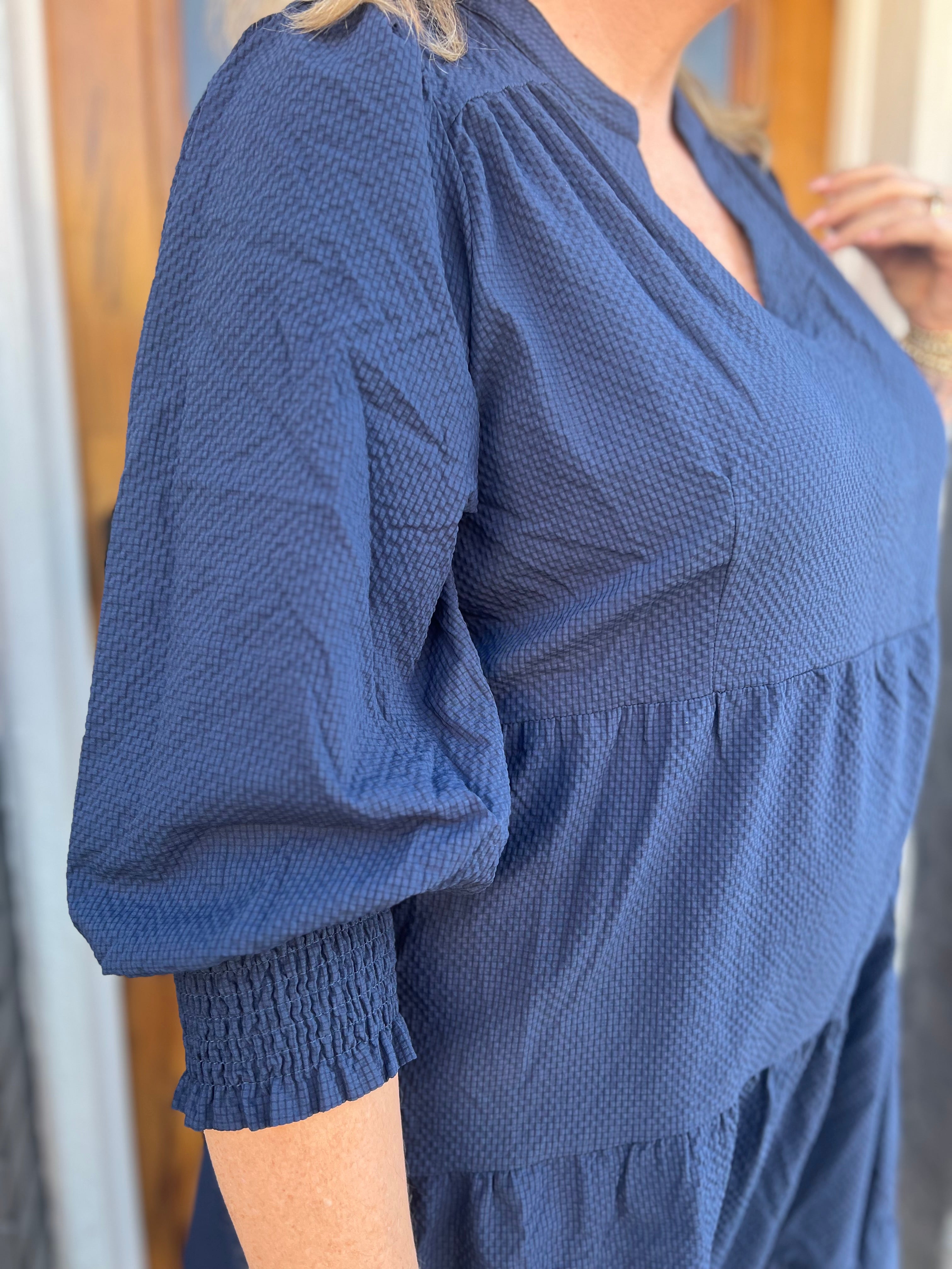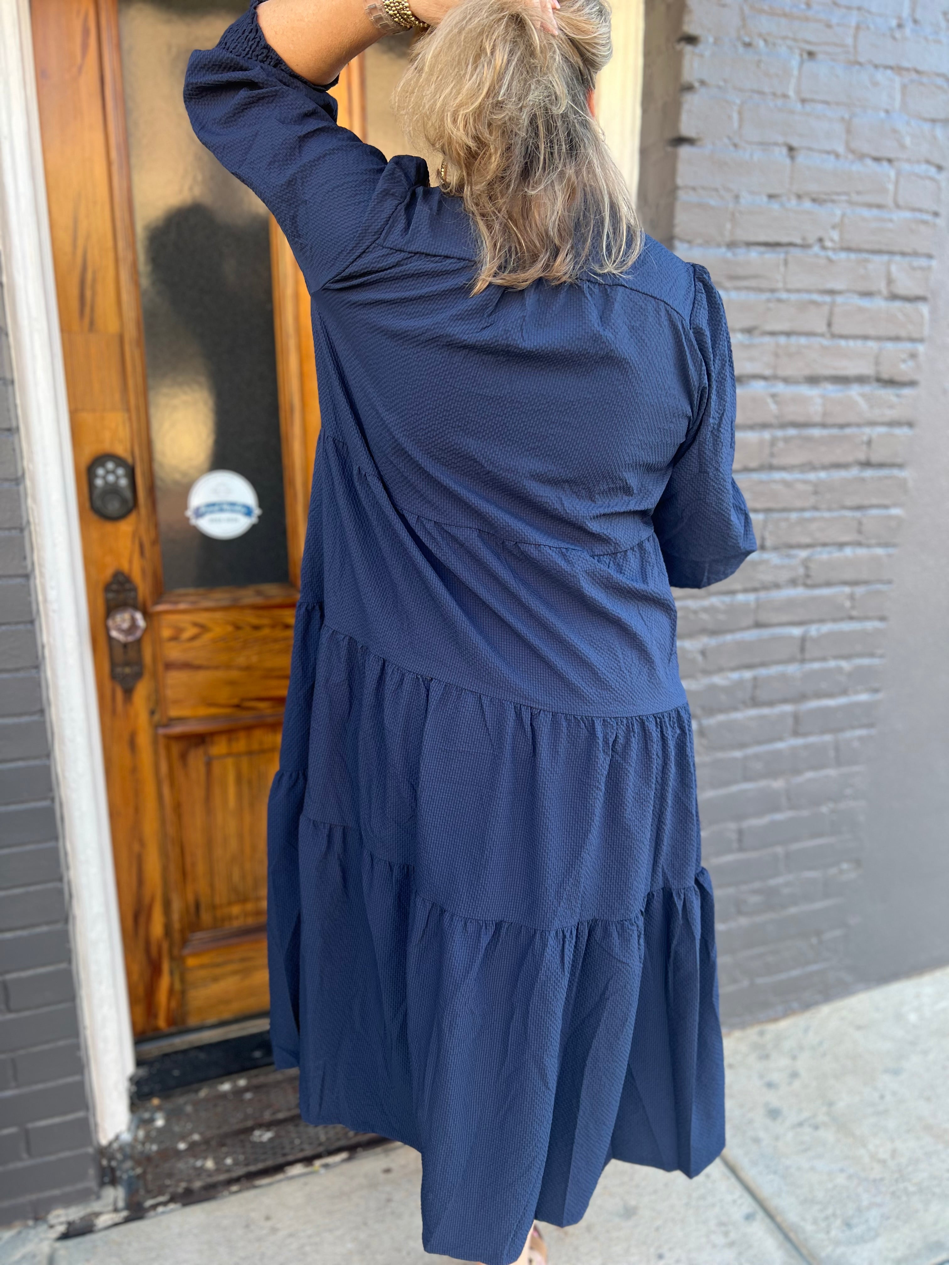 Elevate your wardrobe with this Navy Textured Tiered Midi Dress, designed for effortless style and comfort. Featuring long puff sleeves with smocked cuffs, it offers a flattering silhouette that enhances your natural shape. The V-neck adds a touch of elegance, while the tiered midi length provides graceful movement. Crafted without lining, this dress is lightweight and perfect for layering or wearing on warm days. Ideal for both casual outings and special occasions, it combines timeless charm with modern details to keep you looking and feeling confident.
