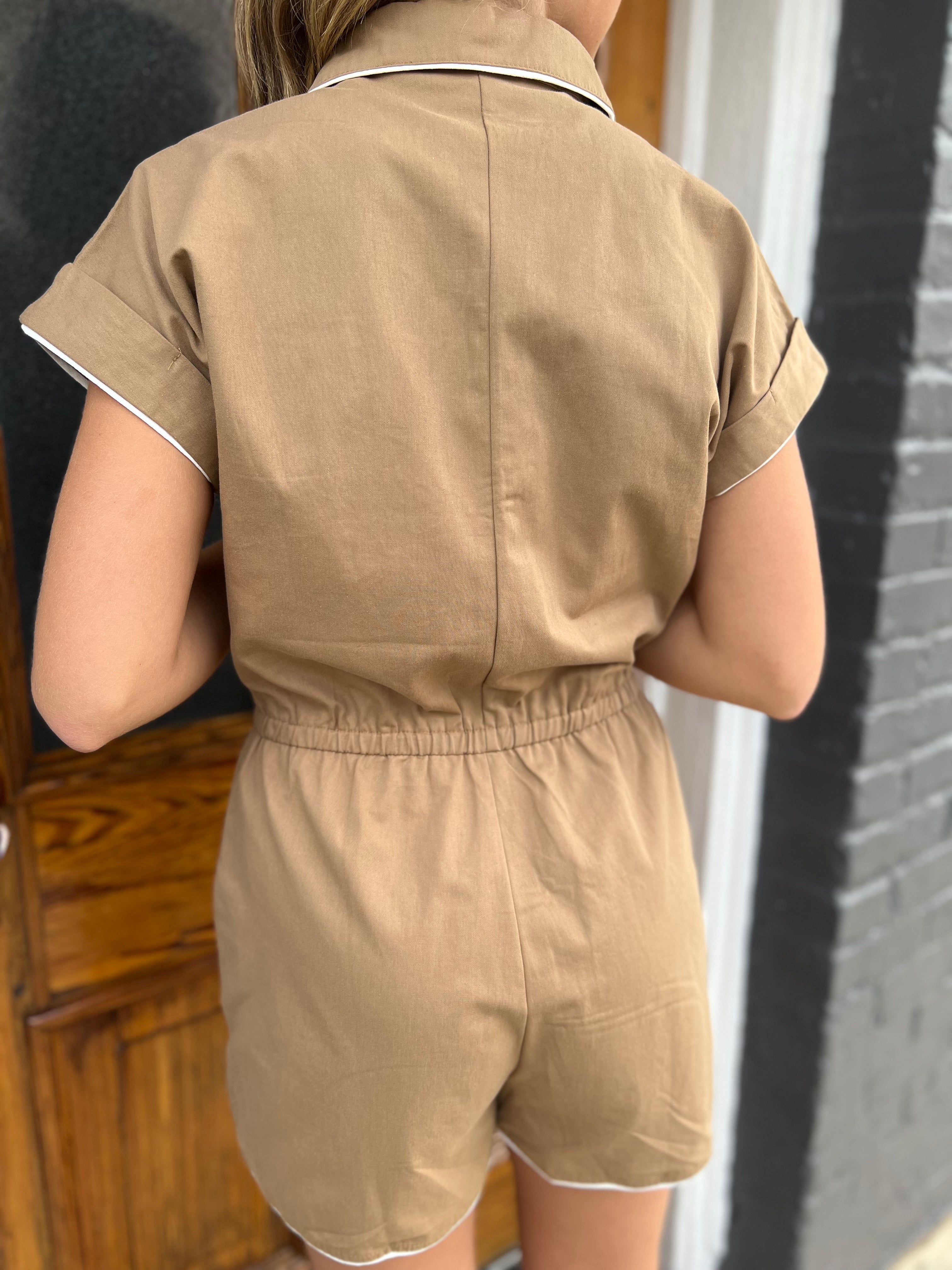 This taupe romper with short sleeves and white piping offers a flattering cinched waist and classic collar. Its button-down front adds charm, making it a stylish, comfortable essential for fall.