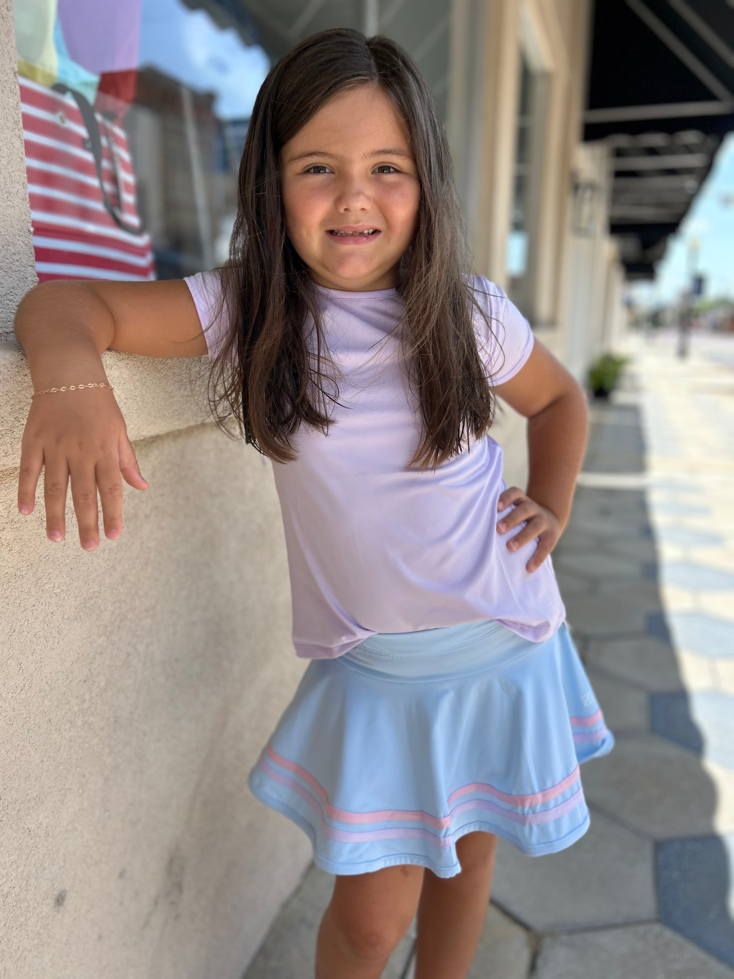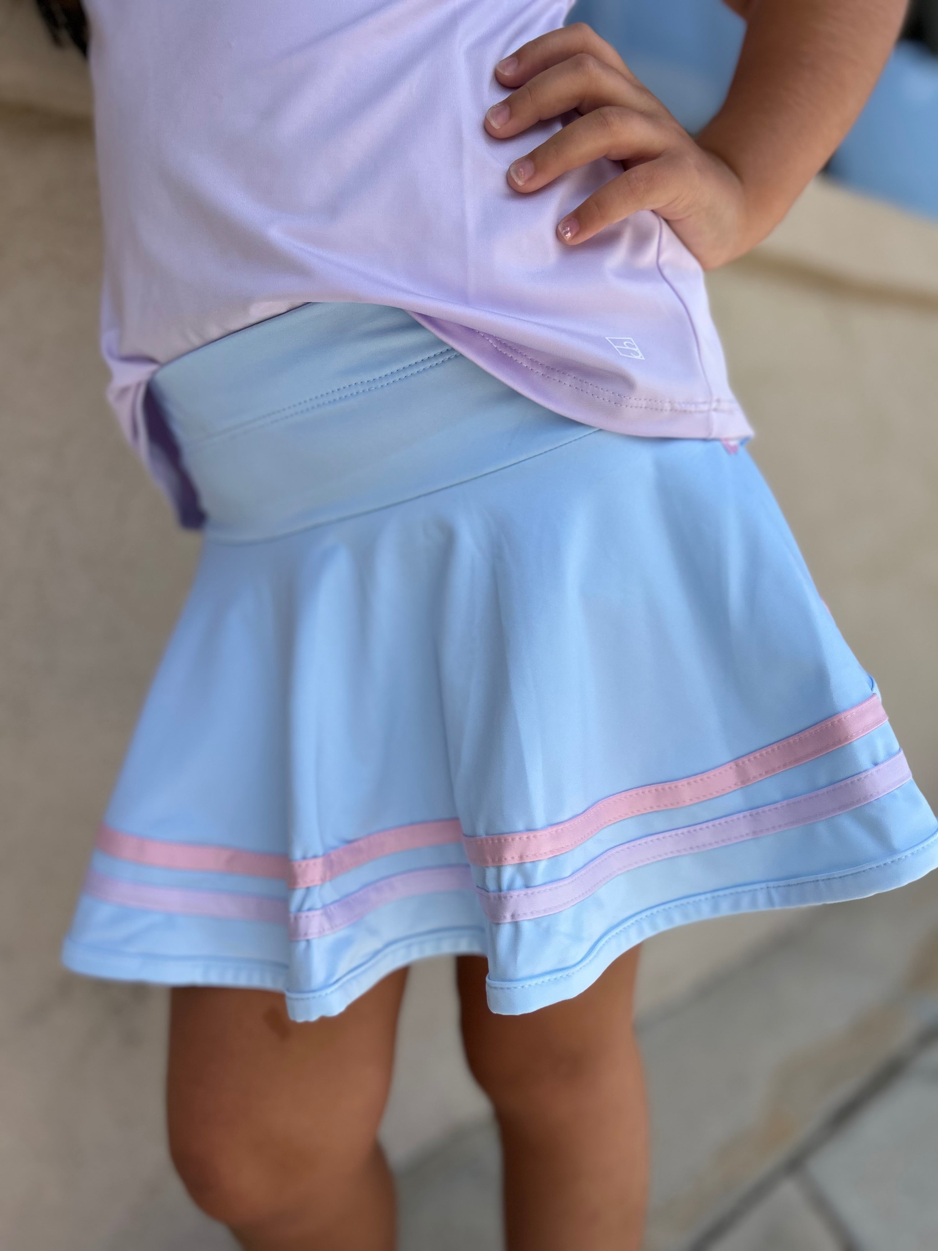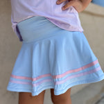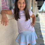 Our Callie Skort is back and will be one of her favorites. This Cotton Candy Blue skort in athleisure fabric with Cotton Candy Pink and Petal Purple welting and built-in shorts will make her the best-dressed girl for all her tennis matches.