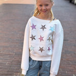 This cream sweatshirt features a vibrant star patch applique in cheetah, pink, and blue, making it a stylish choice for back-to-school days. Perfectly paired with shorts, jeans, or a skort, it offers both comfort and a fun, trendy look your girl will love.