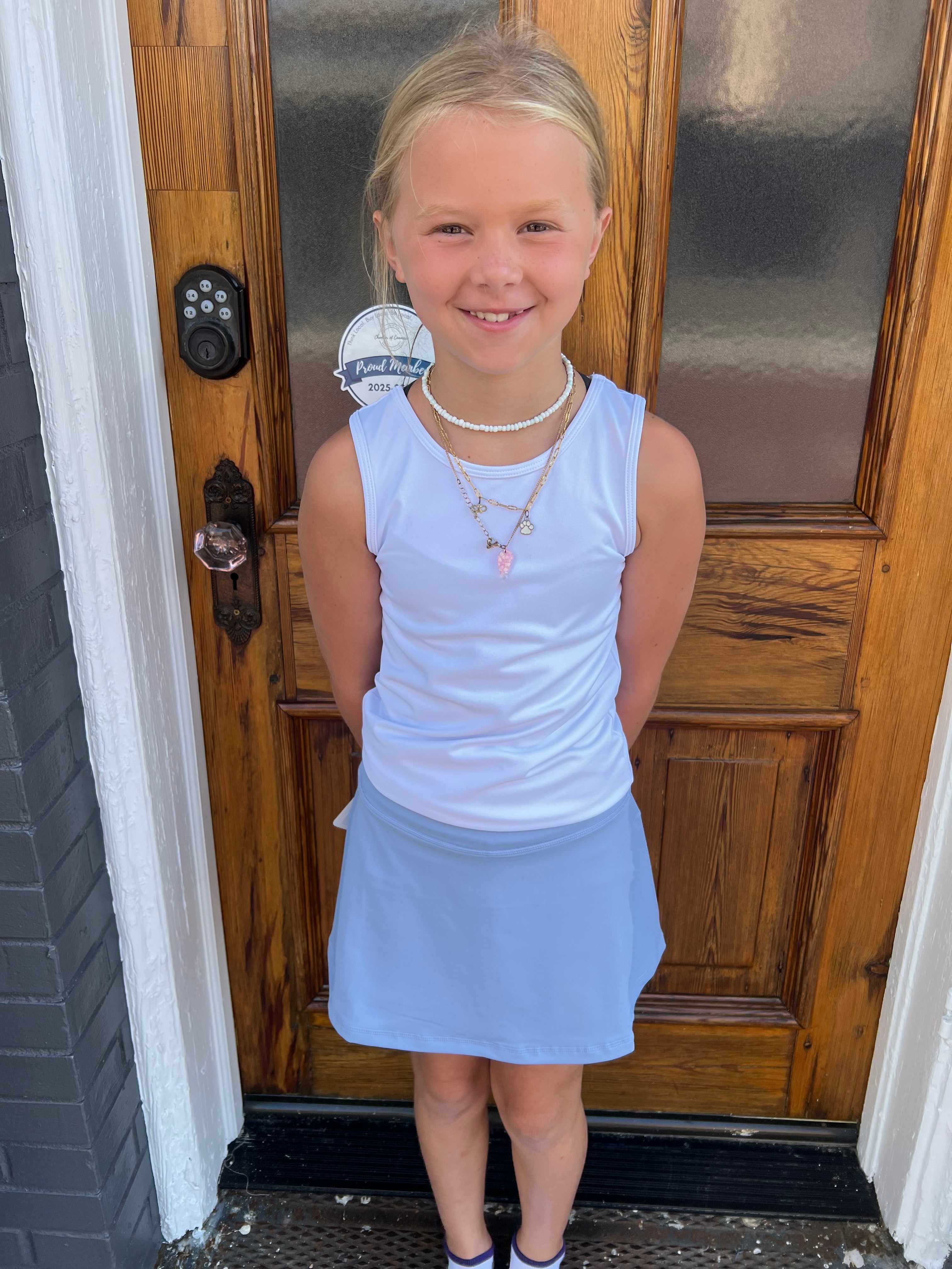 The Bella Girls Tennis Skirt in Blue combines style and functionality with built-in shorts and a convenient side pocket for essentials on the move. Its back zipper pocket on the waistband offers secure storage, perfect for keeping small items safe during play. Pair it effortlessly with a cute tank or your favorite tee for a sporty yet chic look that keeps you ready for action.