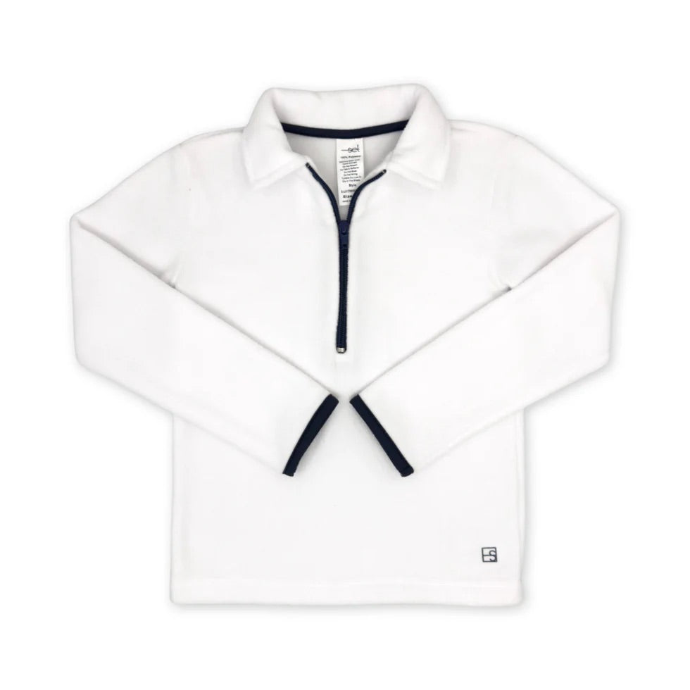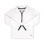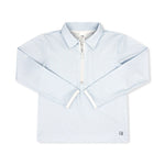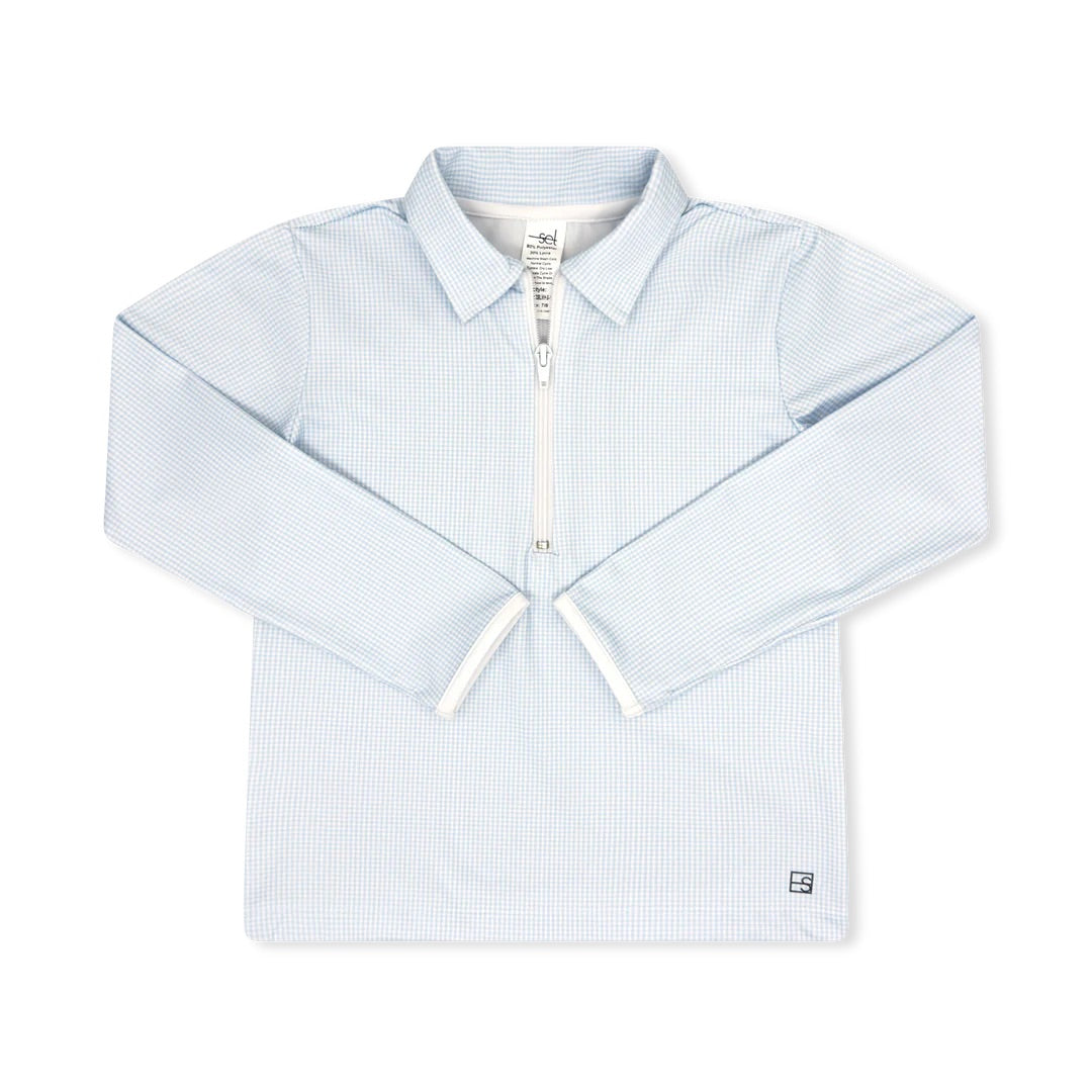 Our Henry Half Zip in?Cotton Candy Blue Minigingham?and Pure Coconut zipper is the perfect layering piece for cooler days!?From sports to comfy days at home, it'll be his?favorite to grab and go!