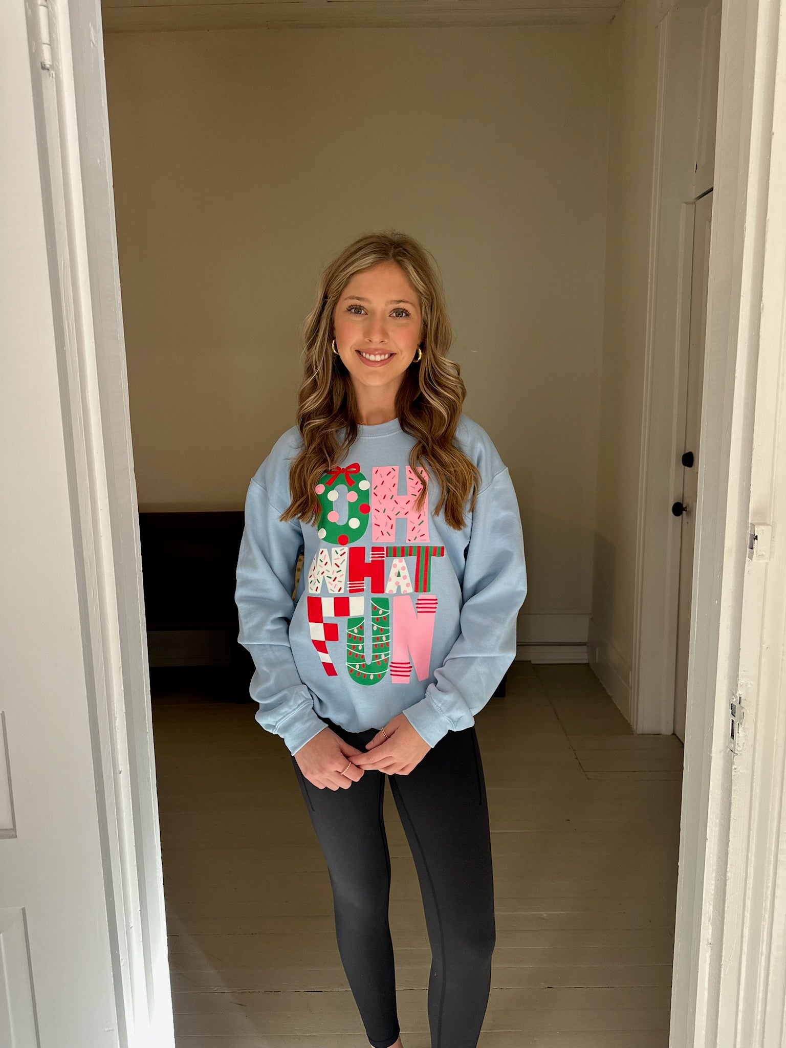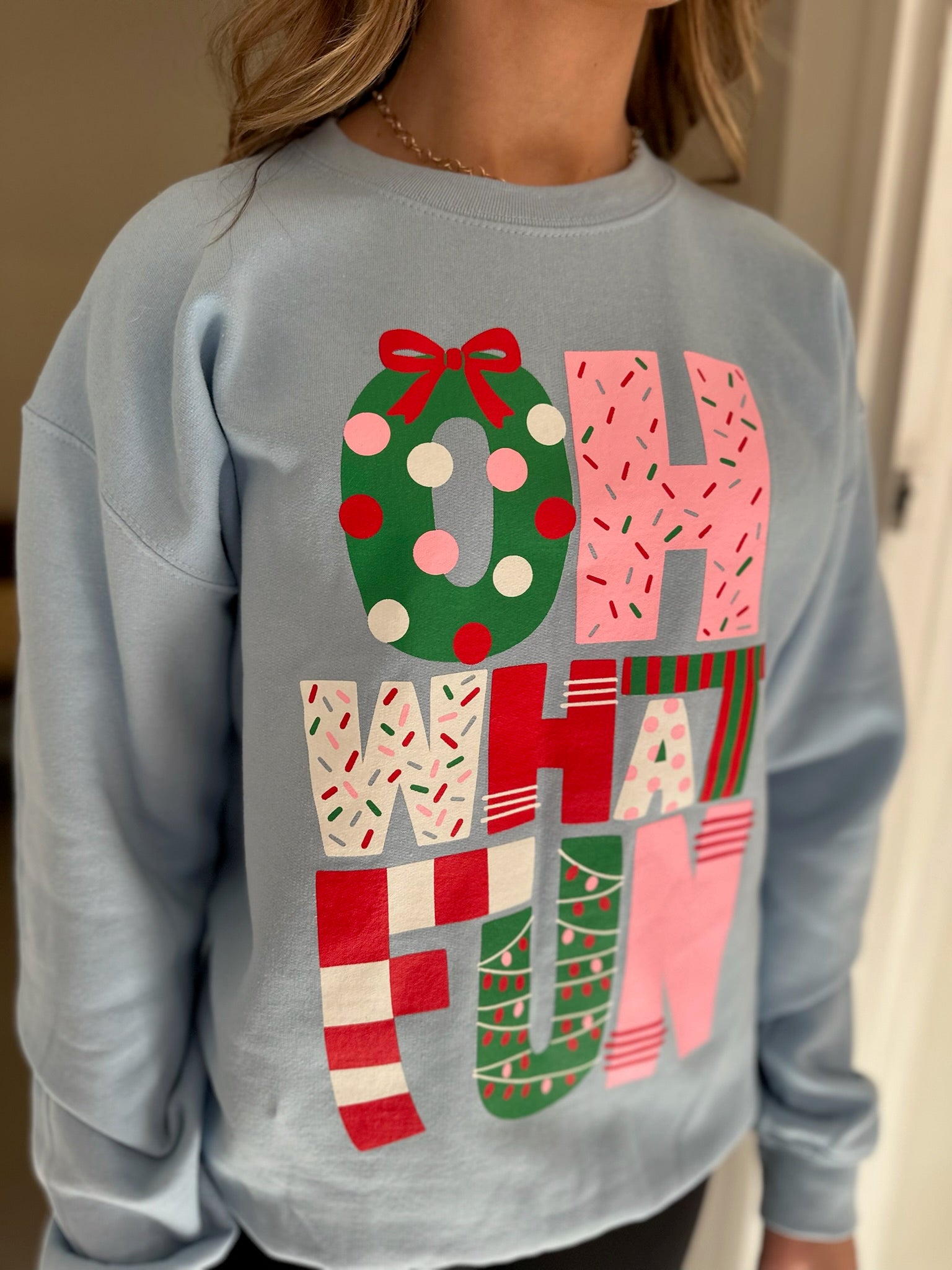 Celebrate the season in cozy style with the OH WHAT FUN Sweatshirt in blue. This soft, comfortable sweatshirt features vibrant, playful lettering that brings a cheerful holiday spirit to every outfit. Whether you're enjoying festive gatherings or lounging at home, its warmth and colorful design make it the perfect choice to brighten your winter days.