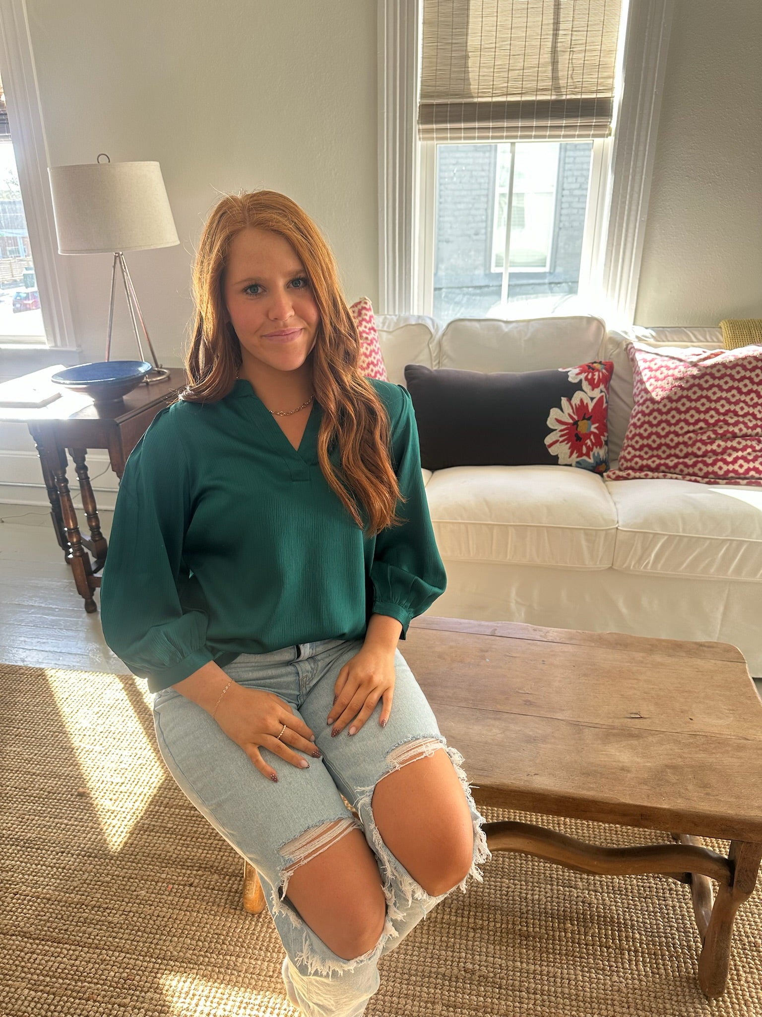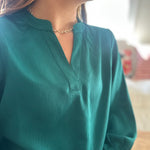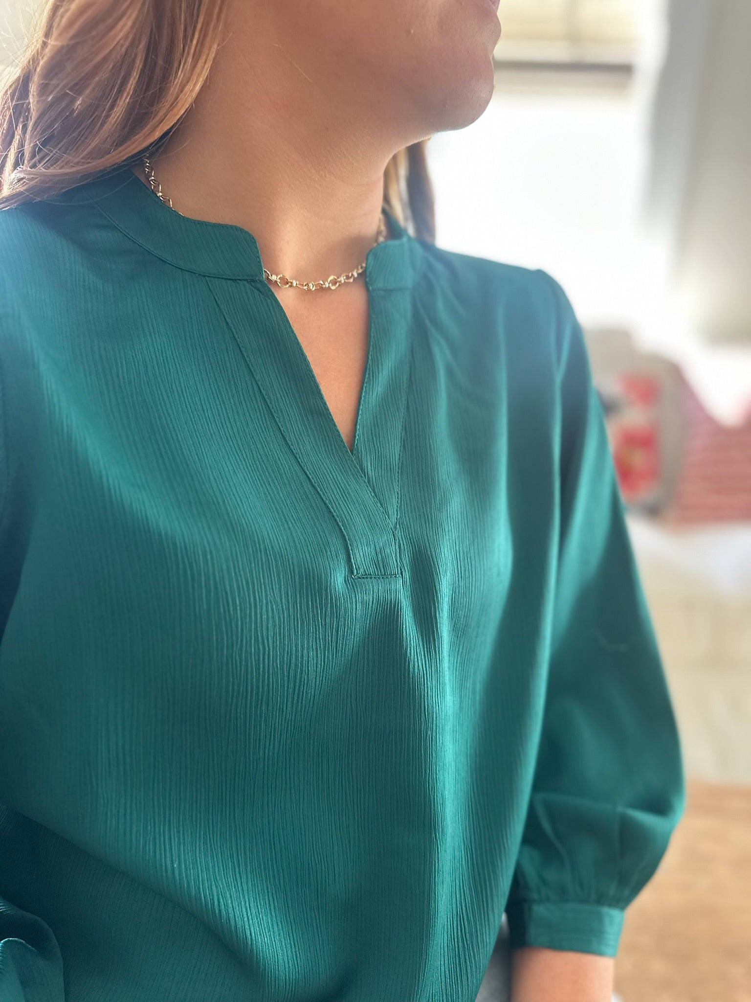 The Tamryn Top in Aventurine Green effortlessly blends comfort and style with its flattering three-quarter puff sleeves and refined cuff details. Its relaxed fit ensures all-day ease, making it perfect for casual outings or elevating your look for special occasions. Embrace versatile elegance with this must-have wardrobe staple.