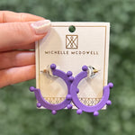 Boost your school spirit with our vibrant Astrid Earrings! These purple hoops feature fun purple ball accents, making them the perfect accessory for any spirited event. The medium size hoop adds a touch of sophistication to any outfit. Show off your school pride with these stylish earrings!