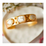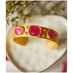 THREE STONES SET ON TOP OF A MATTE GOLD CUFF THAT IS ADJUSTABLE TO ANY WRIST SIZE