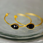 A twist on a basic hoop! Choose from one of four stone options including Black Agate, White CZ, Grey Stone, and Natural Turquoise. These earrings share the same teardrop dotted bezel setting as our Madison 6 Stone Cuff, so they look perfect worn together!