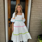 The LYNEE DRESS exudes effortless style with a solid square-neck design and charming rick rack trimming. The half sleeves and smocked back detail add comfort and versatility, while convenient side pockets and a lightweight, lined fabric make it perfect for any occasion. Elevate your wardrobe with this must-have midi dress!