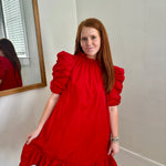 Step out in style with our Red Roosevelt Party Dress by Mudpie! Made with shiny nylon material, this dress features elegant gathered puff sleeves, a charming ruffle neckline, a playful flounce hem, and a bow tie at the back. With a length of 36 inches, this dress is perfect for any party and will make you stand out in the crowd. Add it to your wardrobe today and make a bold statement!