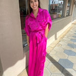 Introducing the ultimate jumpsuit for any occasion - THE WHOLE ENCHILADA! Made from luxurious satin, featuring a wide leg and half button down front. With two chest pockets and two side cargo pockets for extra storage. In a pretty pink color with a collar neckline and tie waist detail. Exude confidence in the loose, flowy fit of this must-have piece!