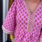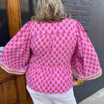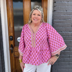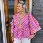 The Monroe Top in Floral Foulard Pink offers a perfect blend of elegance and comfort. Its flattering v-neckline and dramatic bell sleeves create a stylish silhouette, while the unique ladder trim detail adds a chic touch. Designed for versatility, this top effortlessly elevates both casual and dressy outfits, making it a must-have addition to your wardrobe.