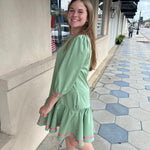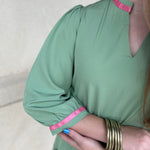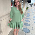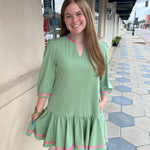 Elevate your style with the Naomi Dress in Basil, designed to blend timeless elegance with modern flair. Its romantic ruffle V-neckline and puffed 3/4 sleeves create a graceful silhouette, while contrast trim details add a refined edge. Practical pockets offer convenience without sacrificing sophistication, making this dress perfect for any occasion where effortless charm is a must.