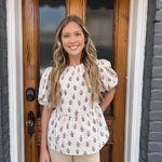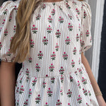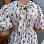 The Nina Cottage Stripes Top in tan features puff sleeves, an adjustable bow at the back, and a tan and white pinstripe design with colorful flower accents for a fresh, stylish look.