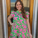 Introducing our luxurious Piece by Piece Abby Dress, featuring delicate pink and green hues and elegant ruffles. With its button down design, this dress exudes sophistication and exclusivity. Perfect for any occasion, from a casual day out to a fancy event. Complete your wardrobe with this statement piece.