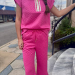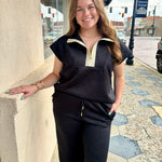 Refresh your wardrobe with the Porter Set, crafted from our exclusive new crosshatch jacquard fabric. Designed with a pop-collar, cap sleeves, and stripe trim ribbon accents on the placket and pant slits, it’s both stylish and functional. The drawstring waistband and pockets provide comfort, while gold accents add a polished finish.