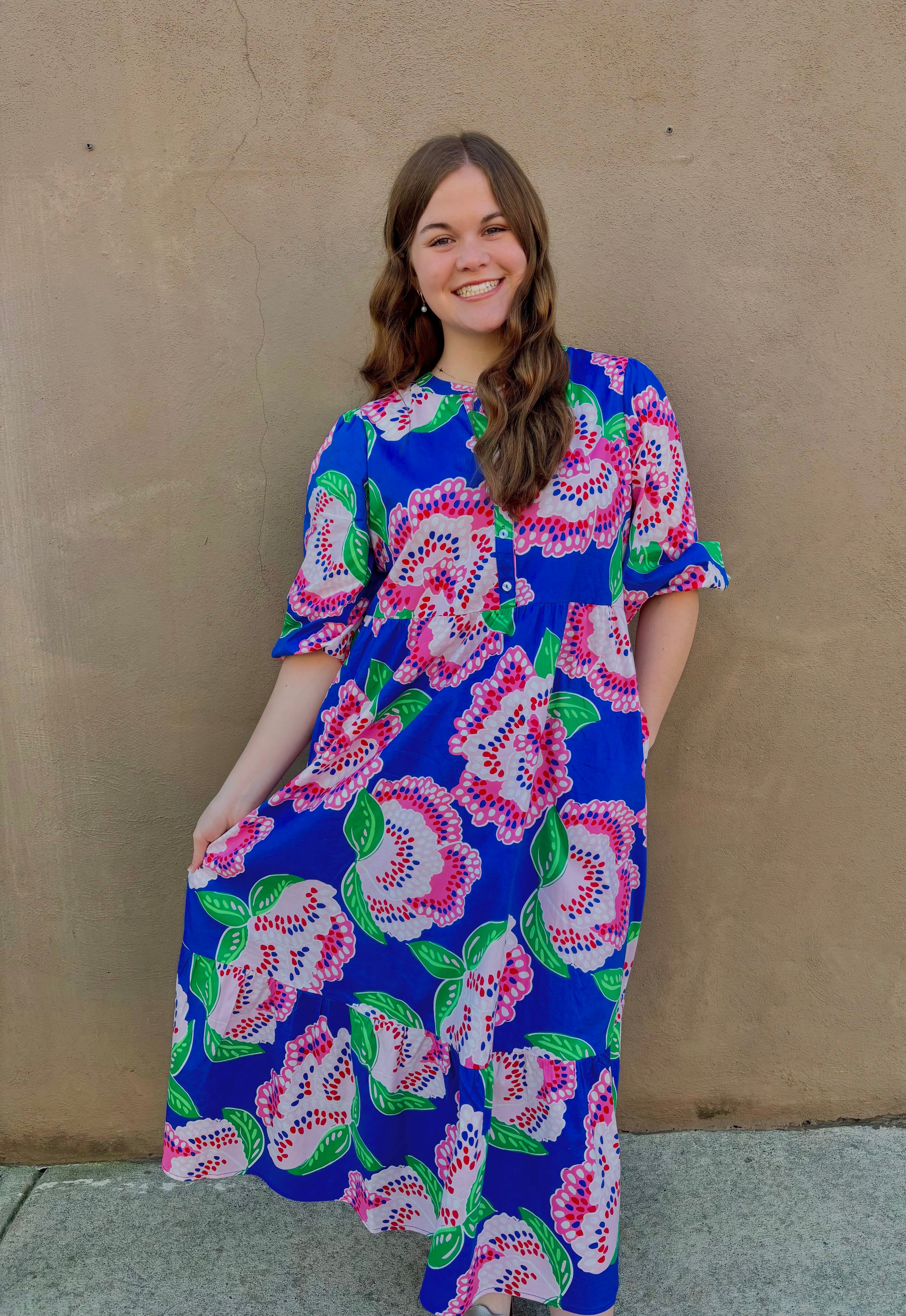 The Riley Dress is a perfect mix of modern style and classic charm. Featuring 3/4 sleeves with an elastic finish for added comfort, this dress also showcases contrast grosgrain detailing at the button placket for a sophisticated touch. The tiered midi skirt creates a flattering silhouette with plenty of movement, while the addition of pockets brings a practical element to this chic design.