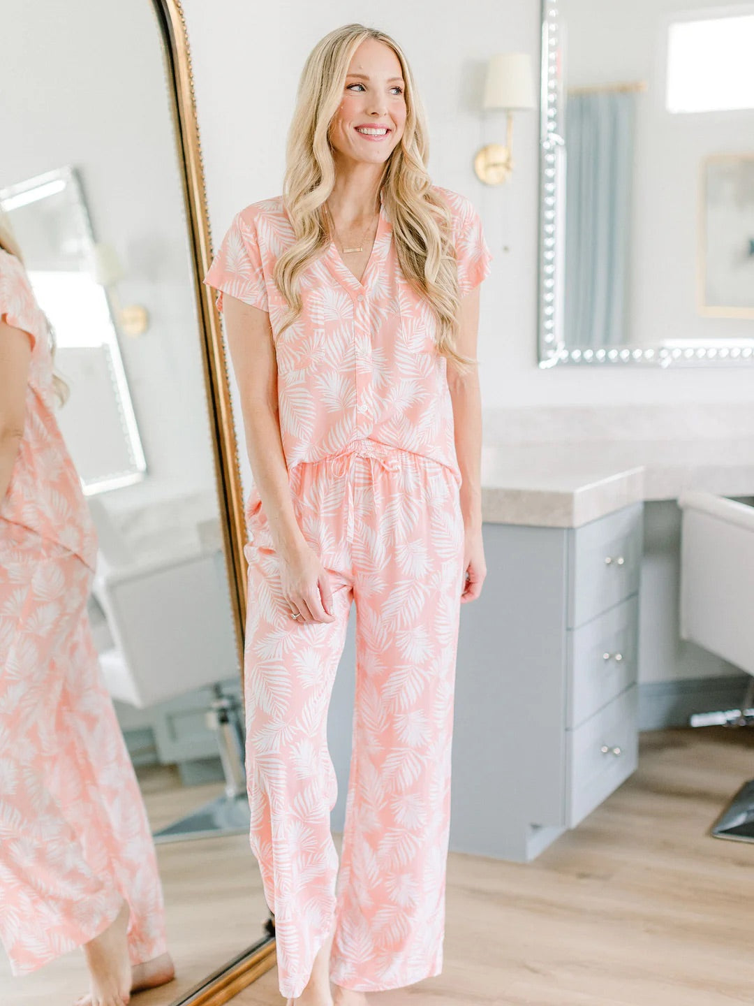 Embrace comfort and style with the SERENA GETAWAY PJ SET. This versatile and cozy set features long pants and a button-up top with a pocket. Perfect for lounging at home or traveling, these pajamas will become your go-to for ultimate relaxation. Upgrade your sleepwear game with the SERENA GETAWAY PANT SET.