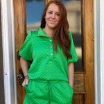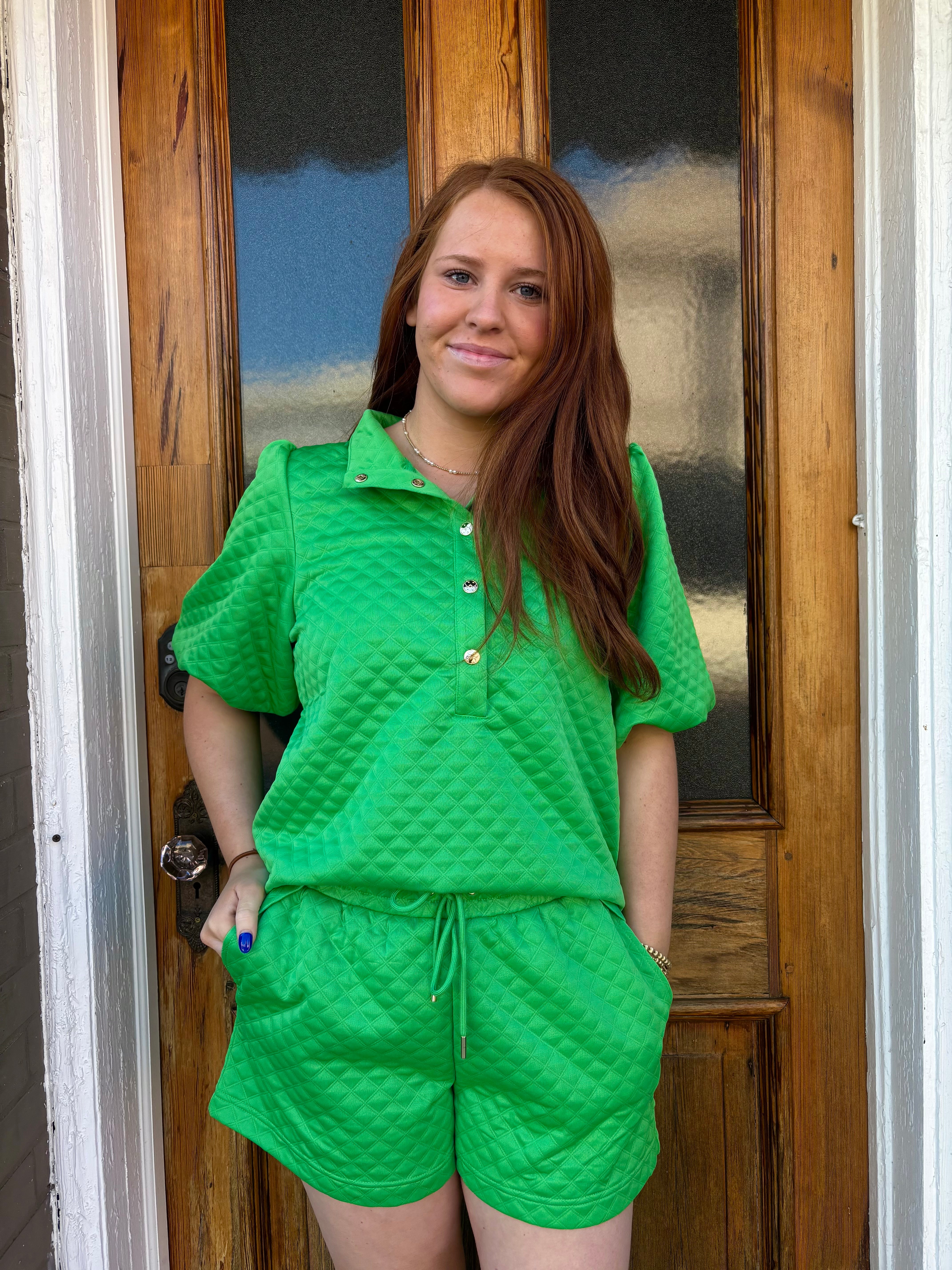 Effortlessly chic, THE MADELYN SET offers versatile style with its signature gold logo snaps, pop-collar detailing, and bubble sleeves. Featuring a drawstring waistband with gold end caps, this set provides a flattering fit while the 95% polyester and 5% spandex fabric ensures comfort. Inseam measures 3.5" for sizes XS-XL. Elevate your wardrobe with this must-have set!