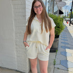 The Stephie Set in ivory exudes elegance and practicality with its cap sleeves, pop-collar design, and functional pockets. The gold accents add a touch of luxury to this versatile and stylish set, perfect for any occasion.