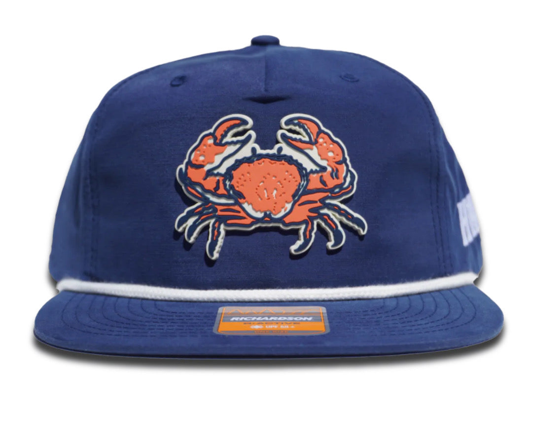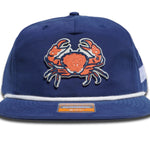 Take on the coastal vibes with our Coastal Crab Hat by Hurricane Marsh! This navy cap features a stylish white rope detail and a raised crab embellishment on the front. Complete your look and pair it with our coordinating t-shirts. Get ready to embrace the beach life!