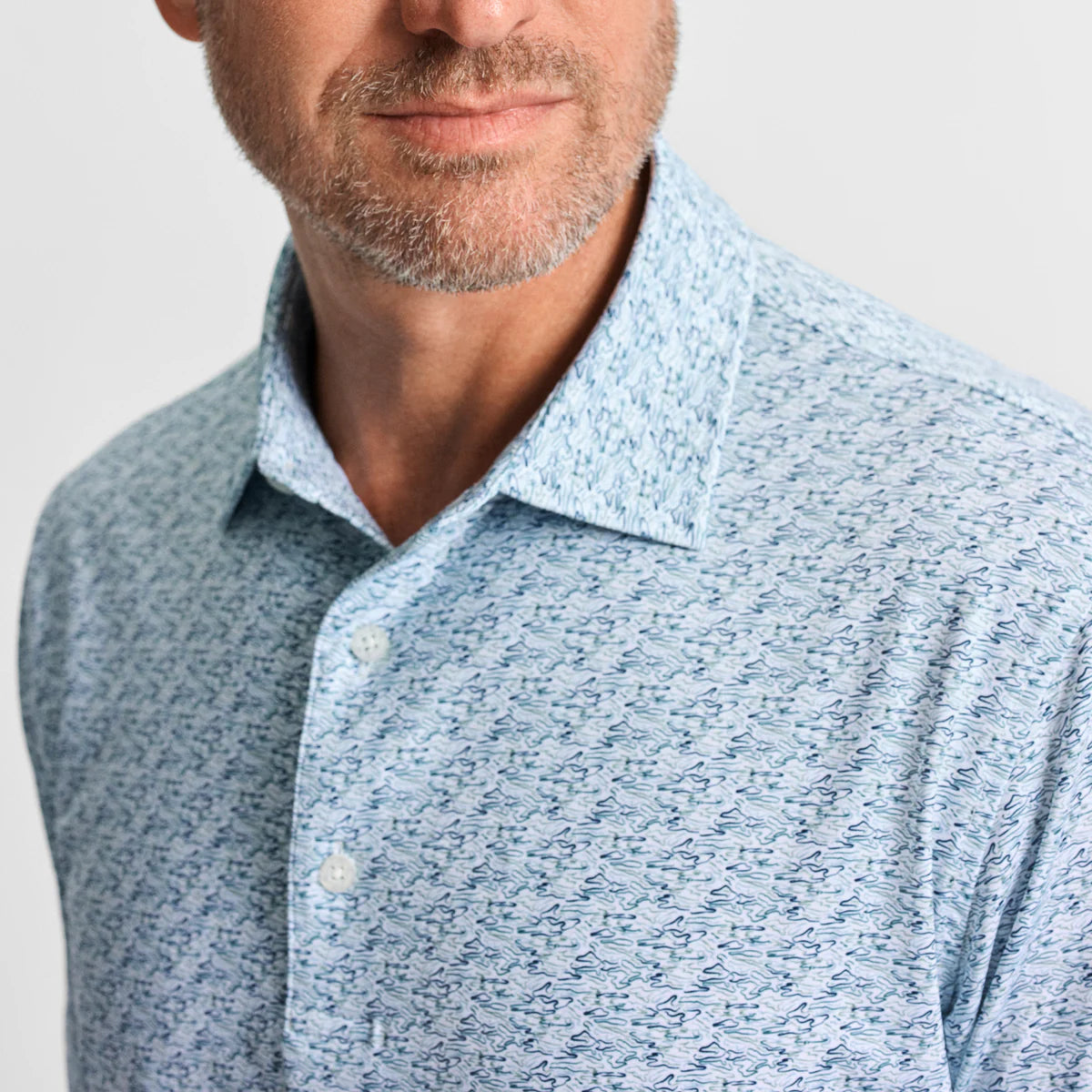 Experience unmatched comfort and style with the Serene Printed Performance Polo. Featuring a soothing blend of blues and greens in a ripple effect, this soft, breathable polo is perfect for all-day wear. The distinctive duck logo at the center back neck adds a unique touch, making it your go-to choice for both casual and active occasions. Once you try it, this top-quality polo will be all you'll want in your wardrobe.