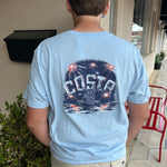 Experience true freedom with FREEDOM FIREWORKS BY COSTA t-shirt. Made with 100% cotton, this short-sleeve crew neck shirt features a regular fit and men's cut for style and comfort. The light blue fabric is perfect for any summer occasion, and the back picture of a boat on the water with fireworks in the air will inspire a sense of adventure and excitement. Make a statement with this one-of-a-kind shirt!