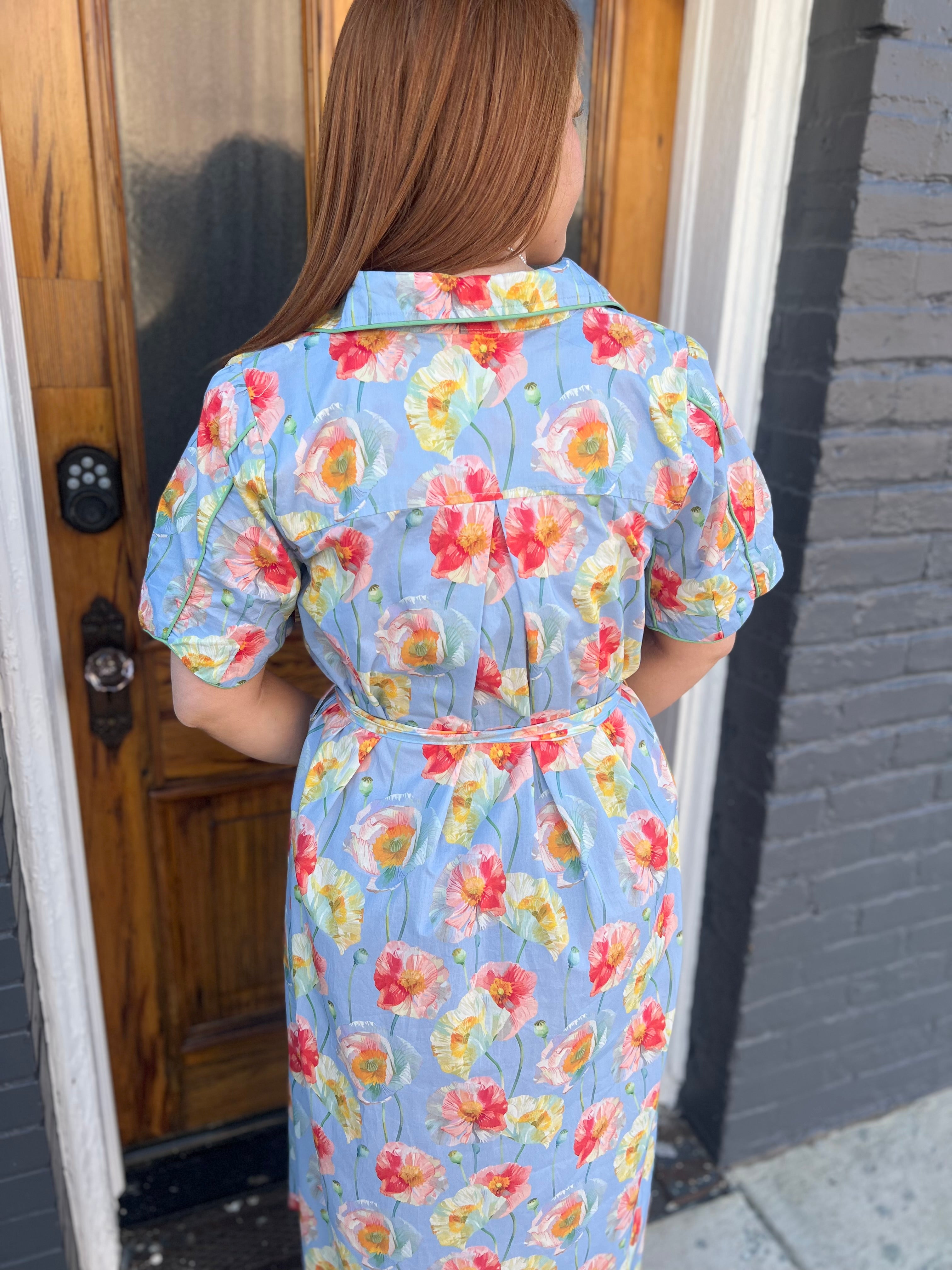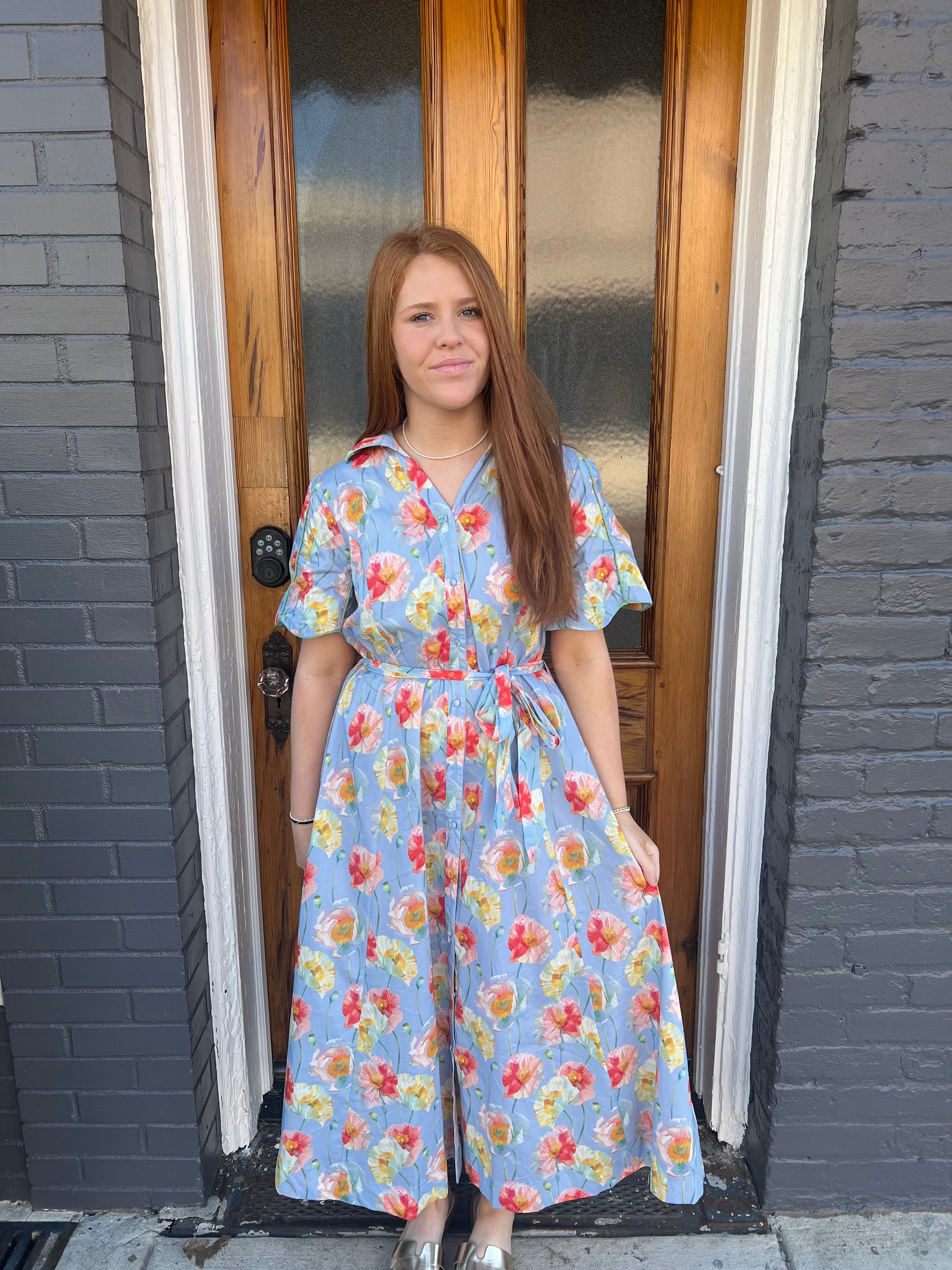 Elevate your everyday wardrobe with this charming button-front floral midi dress in light blue. Featuring a classic collared neckline, delicate flutter sleeves, and a flattering self-tie waist belt, this piece effortlessly transitions from day to night. The vibrant floral pop print adds personality while piping details create visual interest. Cut to a graceful midi length, this unlined dress offers comfortable, breathable wear perfect for warm weather styling. A versatile essential that pairs beautifully with sandals, sneakers, or heels.