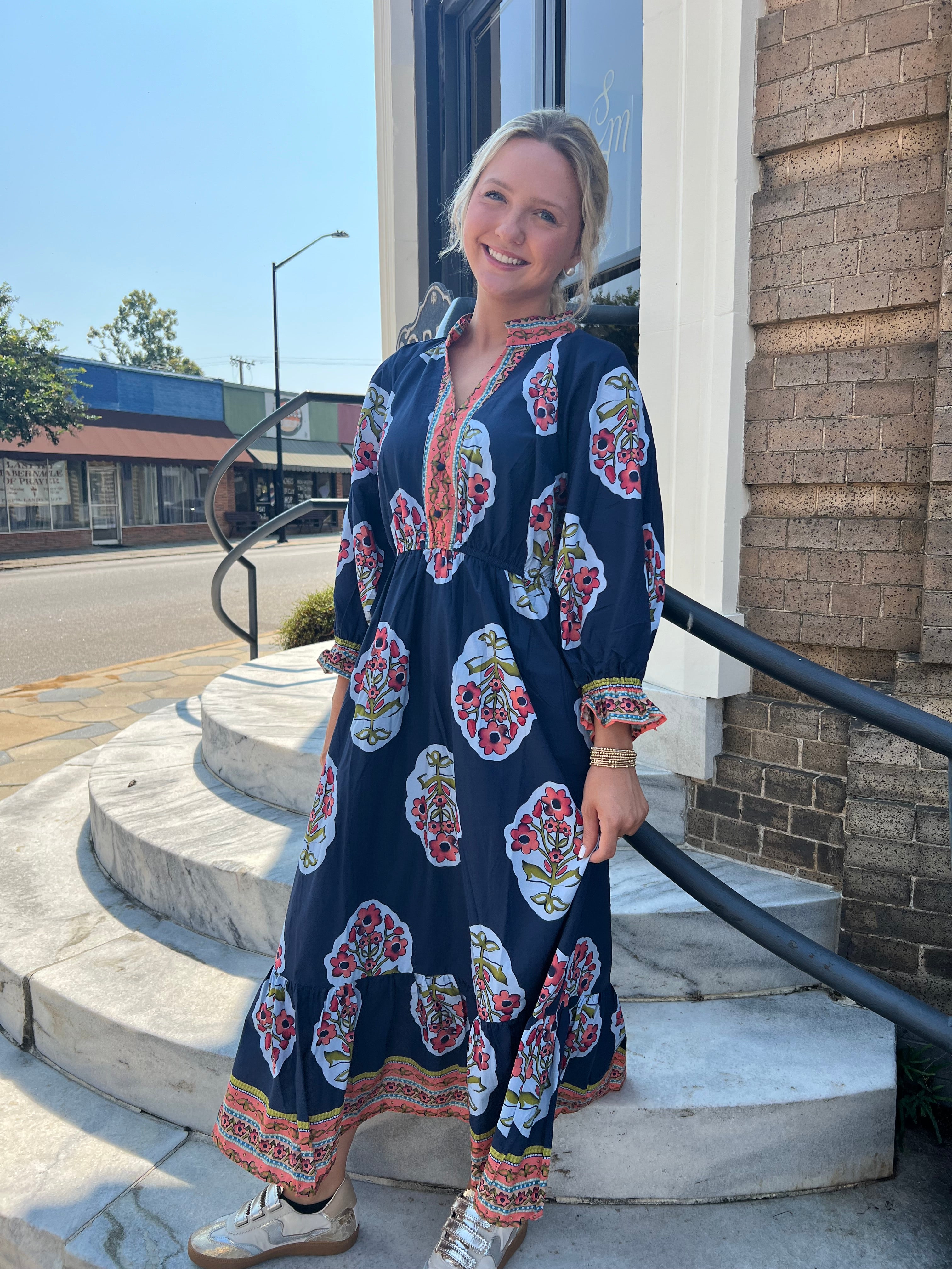 Embrace elegance with the Flower Patch Midi Dress in Midnight Mix. Featuring a delicate flower patch border print, this long-sleeve tiered midi dress highlights a split neckline with a ruffled stand collar for a touch of charm. The elastic waist flatters your silhouette while ruffled hems and cuffs add feminine details. Fully lined for comfort and flow, it’s the perfect dress to captivate at any occasion.